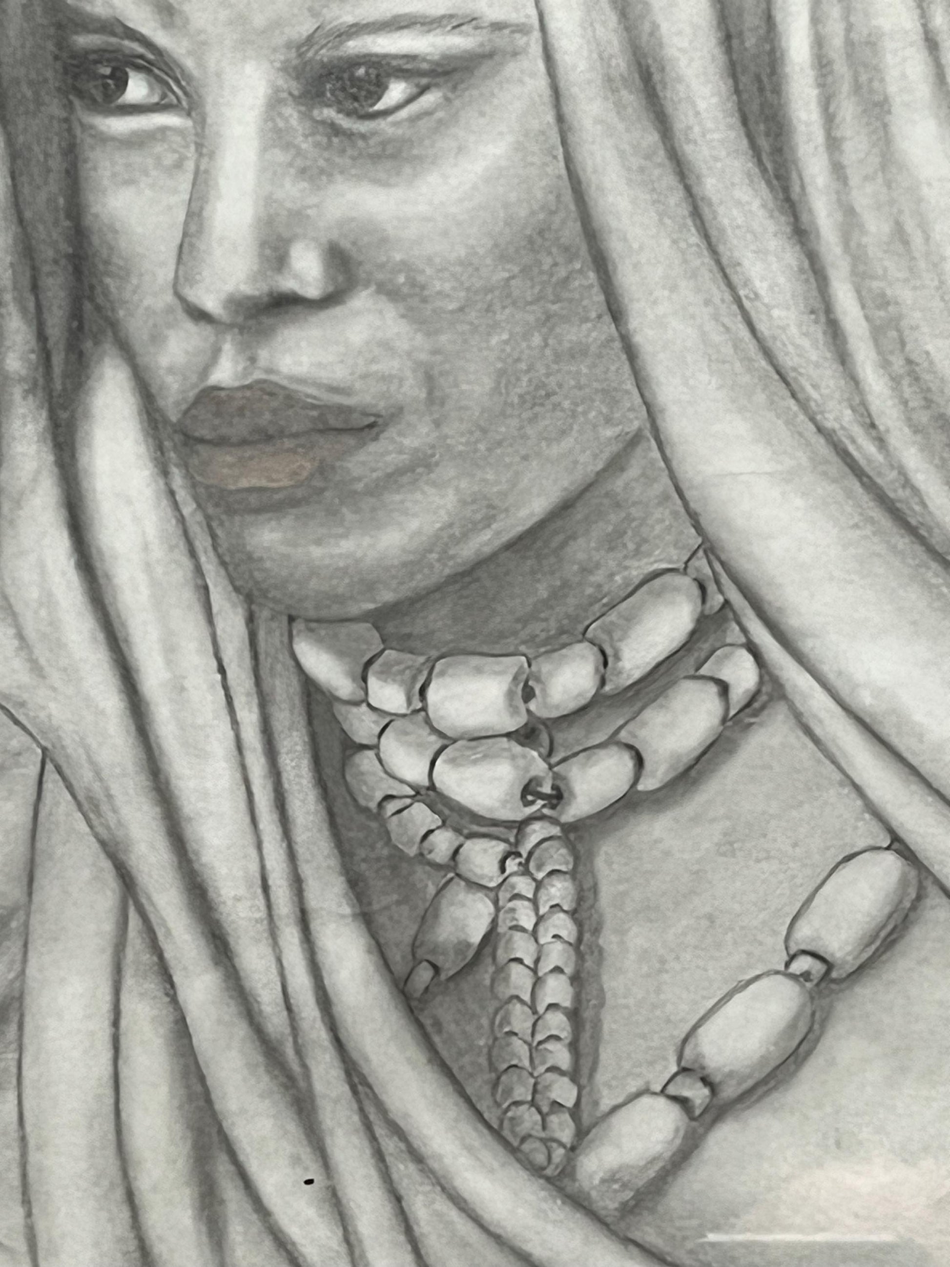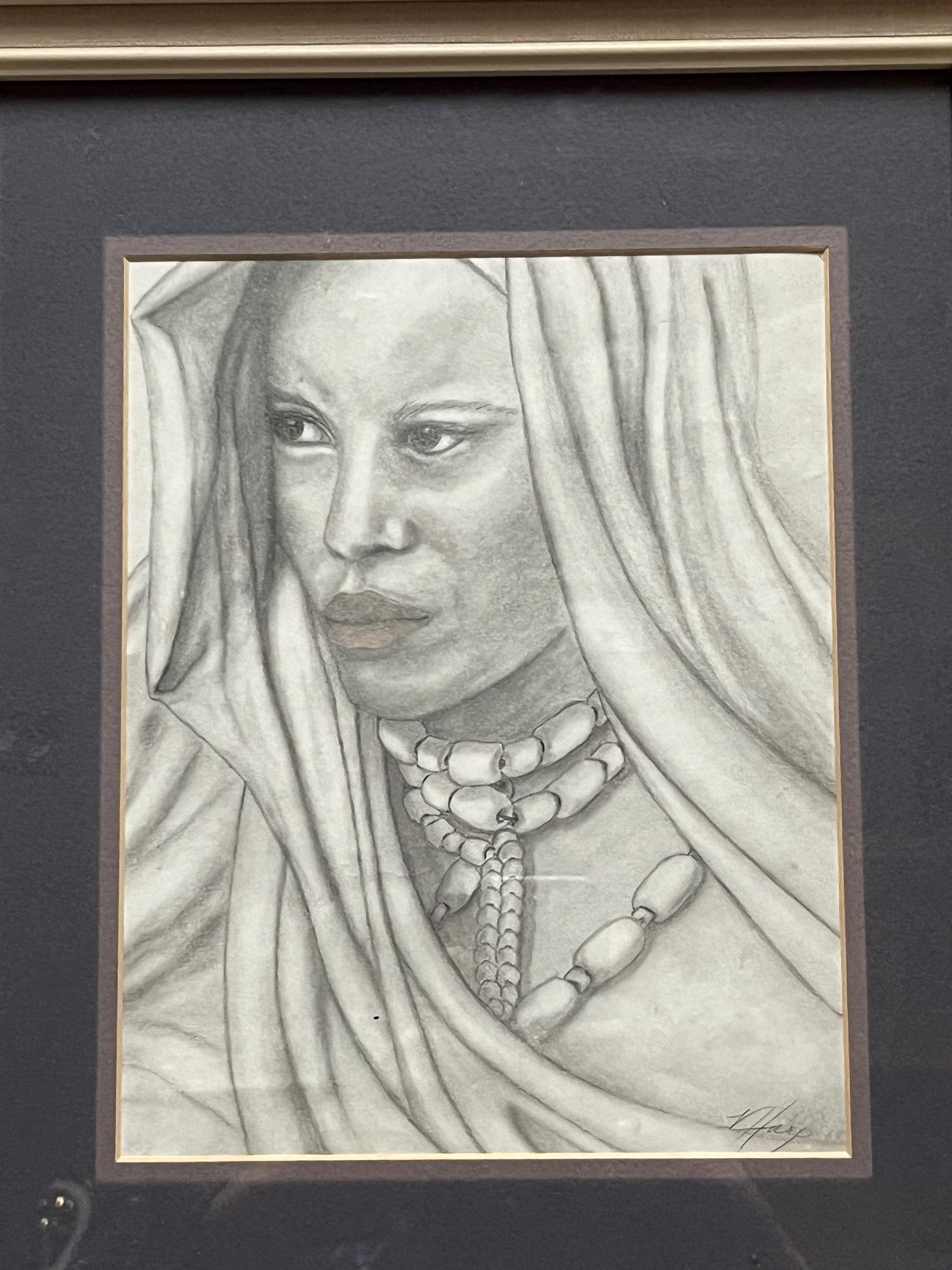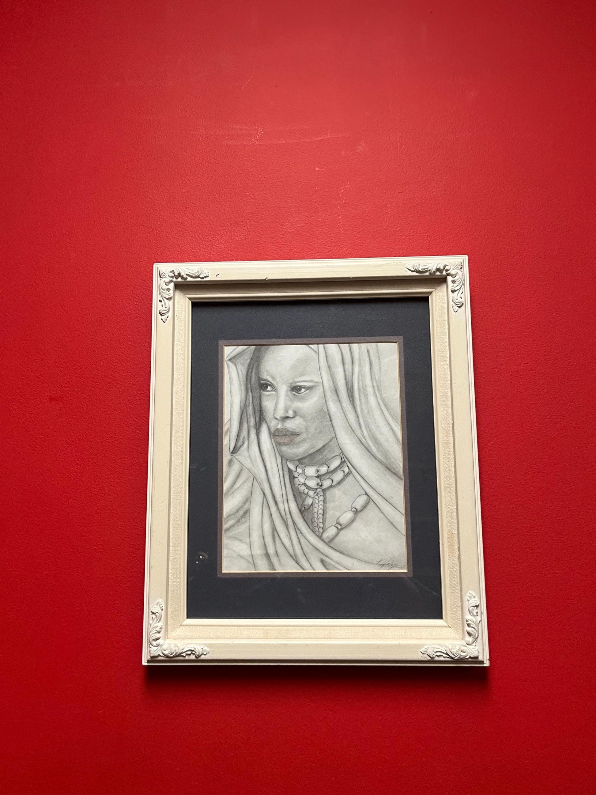 Stunning 16 x 14 inch framed original pencil sketching of an indigenous woman wearing trade beads intense detail - signed! - the eyes!!