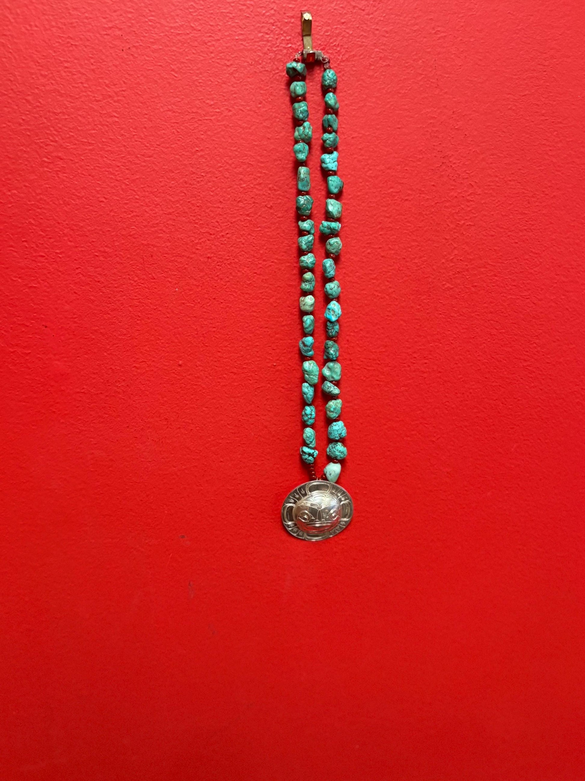 Stunning 18 inch chunky real turquoise necklace with massive 2 inch signed native silver sun mask pendant — highest quality — wow