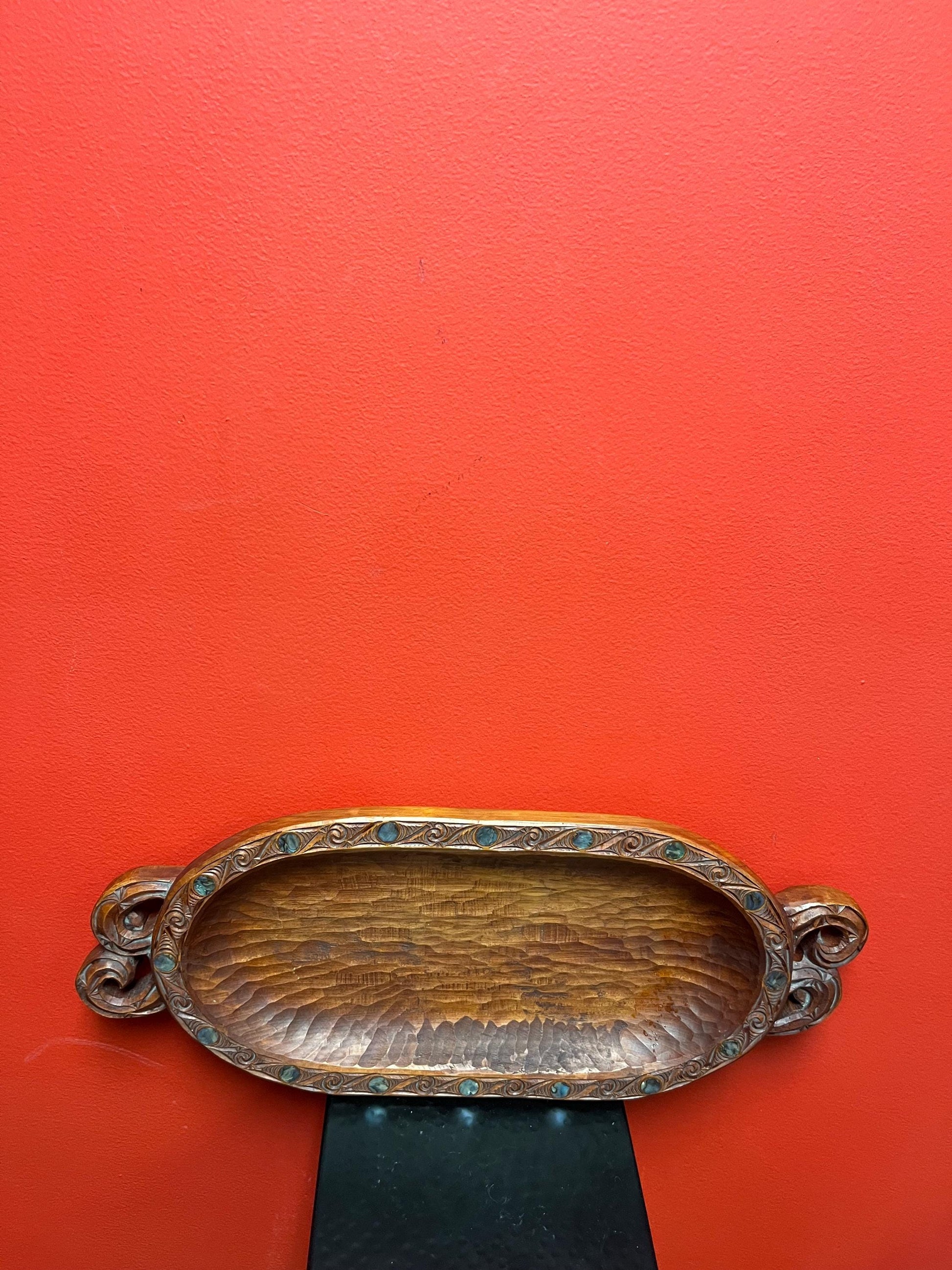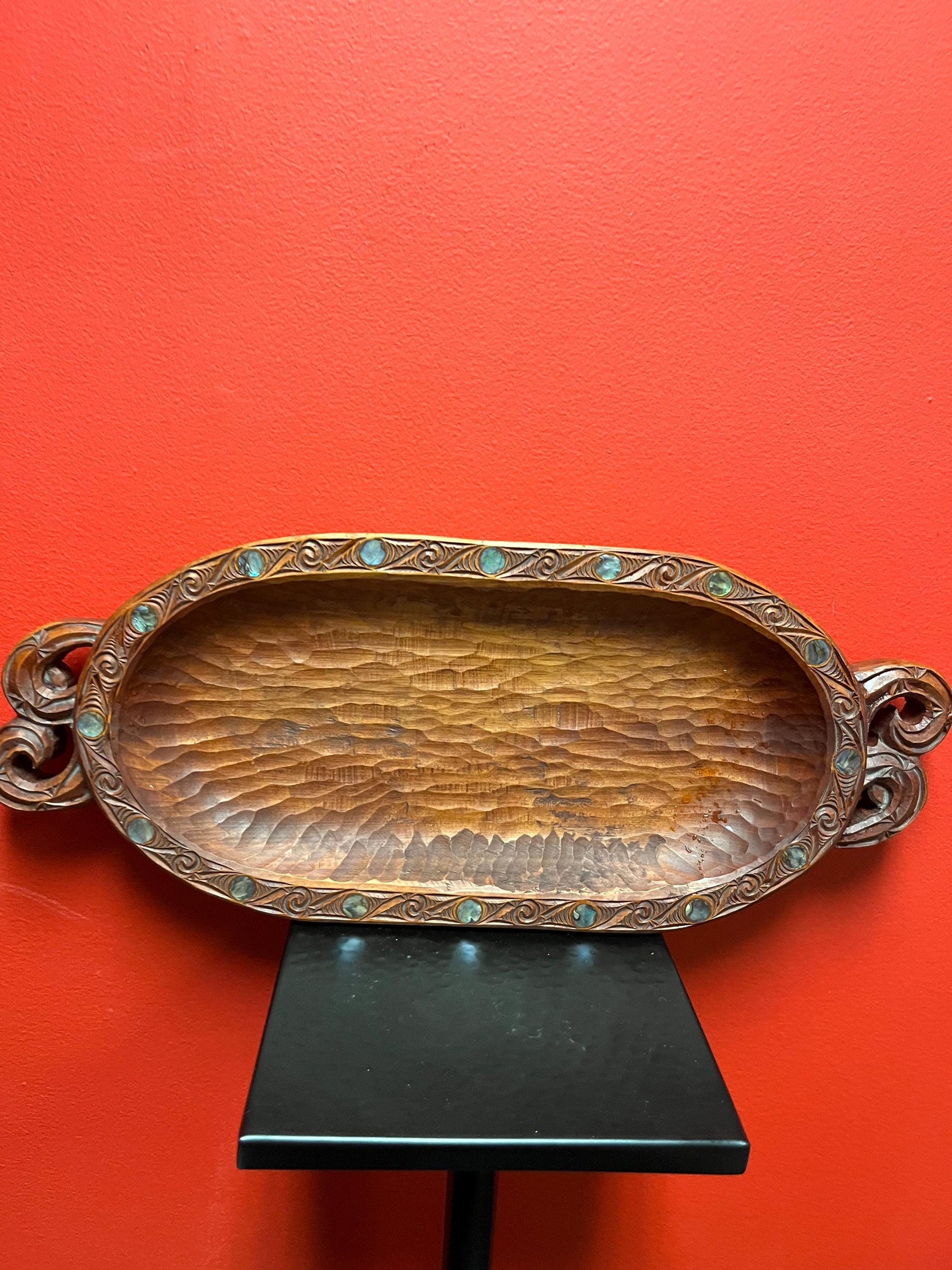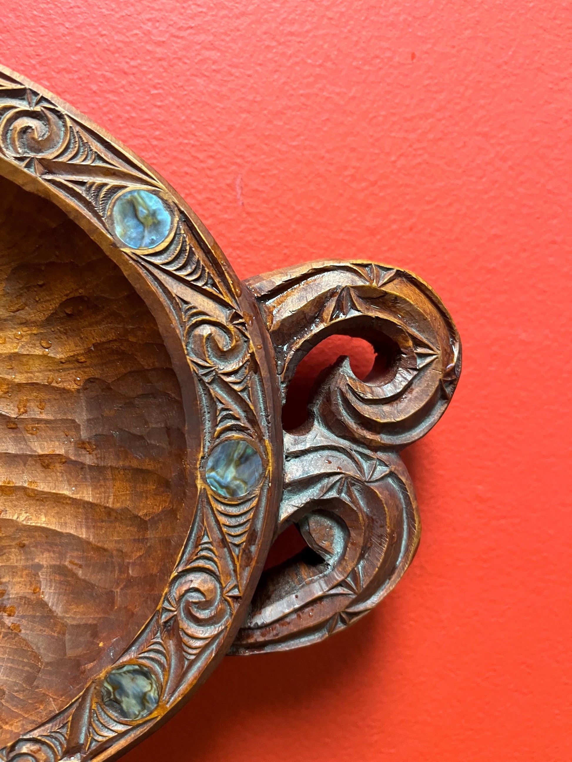 Stunning 18 x 9 inch wide New Zealand Maori feast bowl with Abalone shell 1950s grade A detail