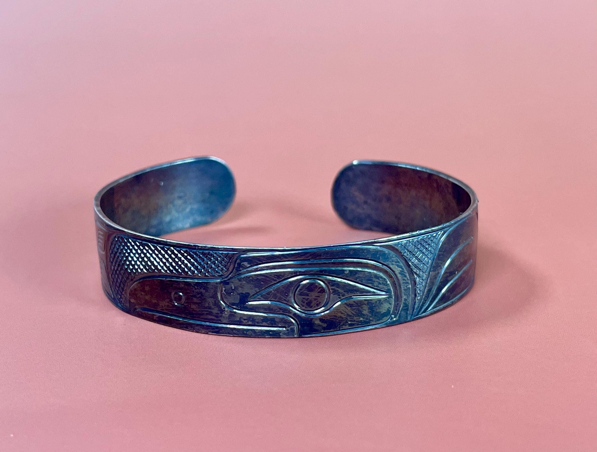 Stunning 2 1/2 inch wide indigenous first nations northwest coast Patti Seaweed Raven bracelet