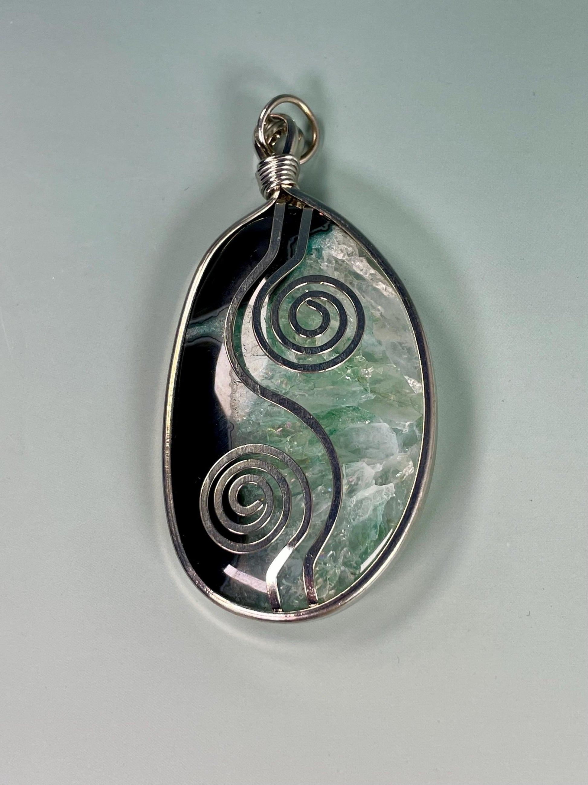 Amazing large pendant showcases a large stone, were not sure but it appears to be a piece of polished geode. Blue-green crystal colours inside. Eye catching and beautiful.