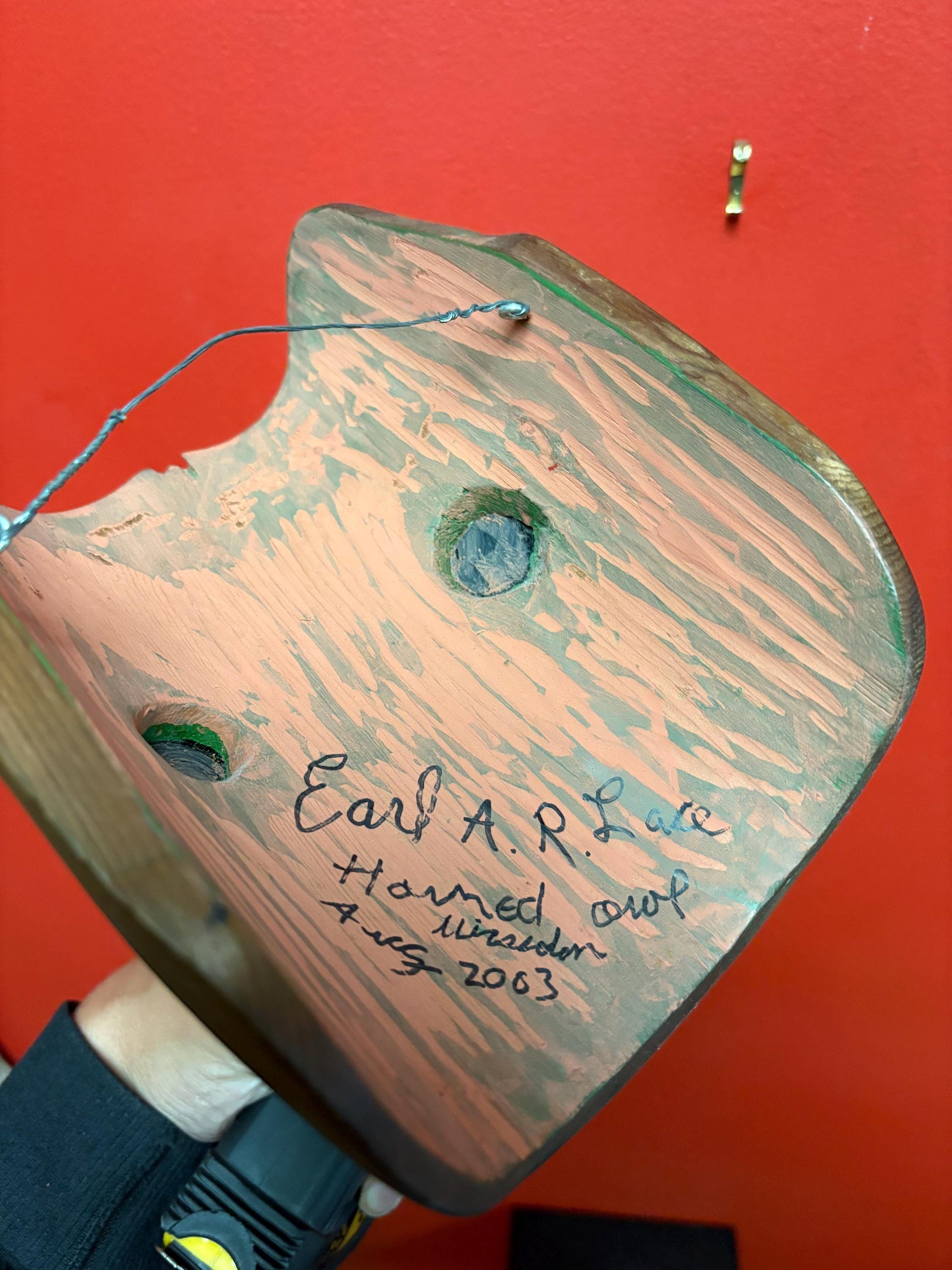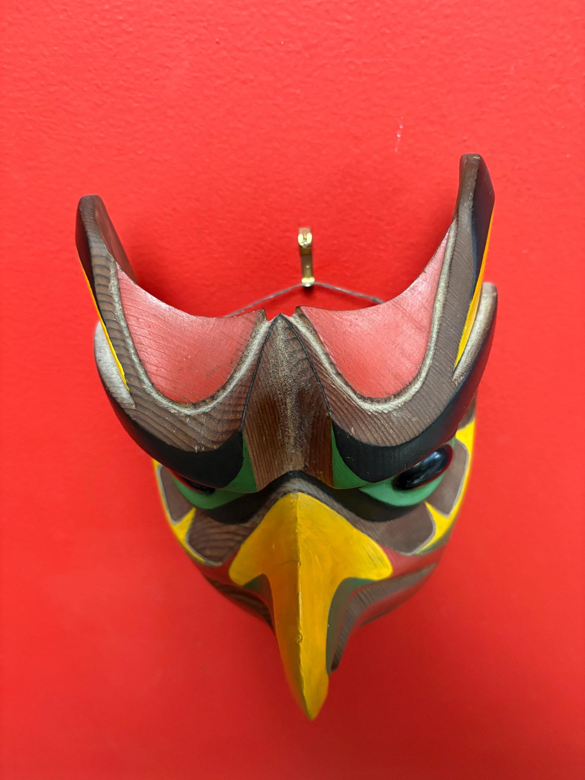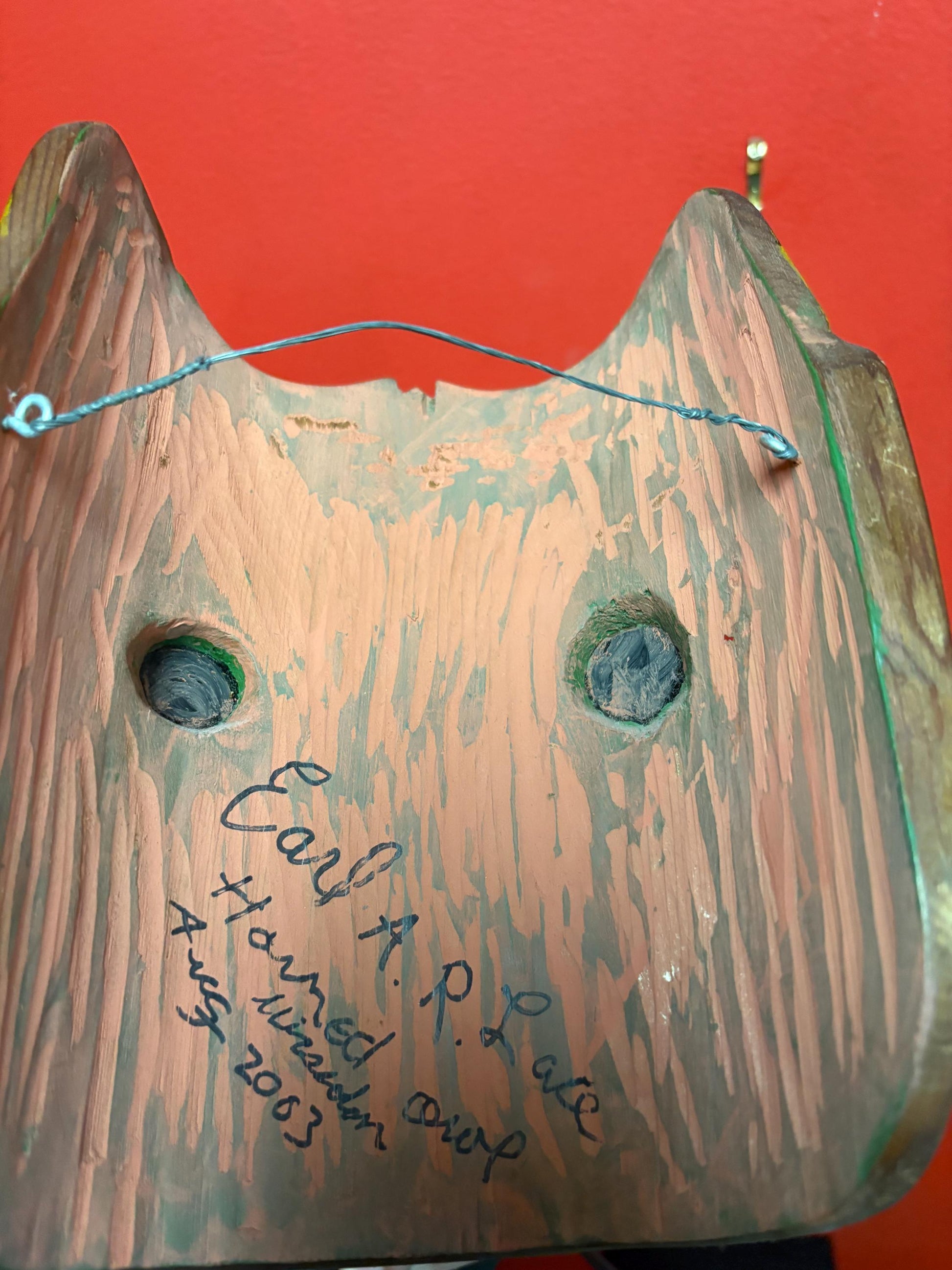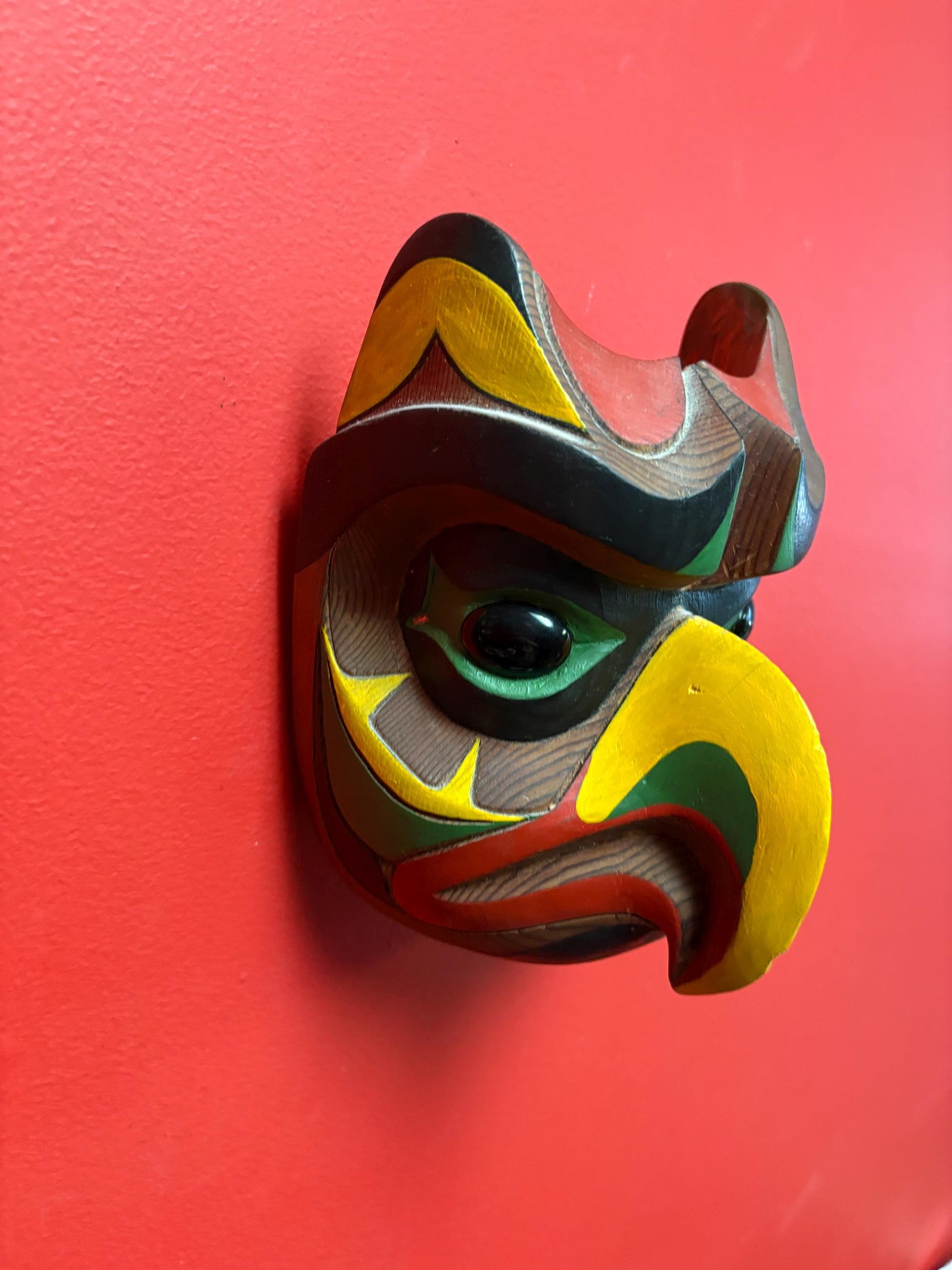 Stunning 7 x 6 wide signed Earl lace polychrome painted owl wisdom mask with glass eyes indigenous first nations pacific north West Coast
