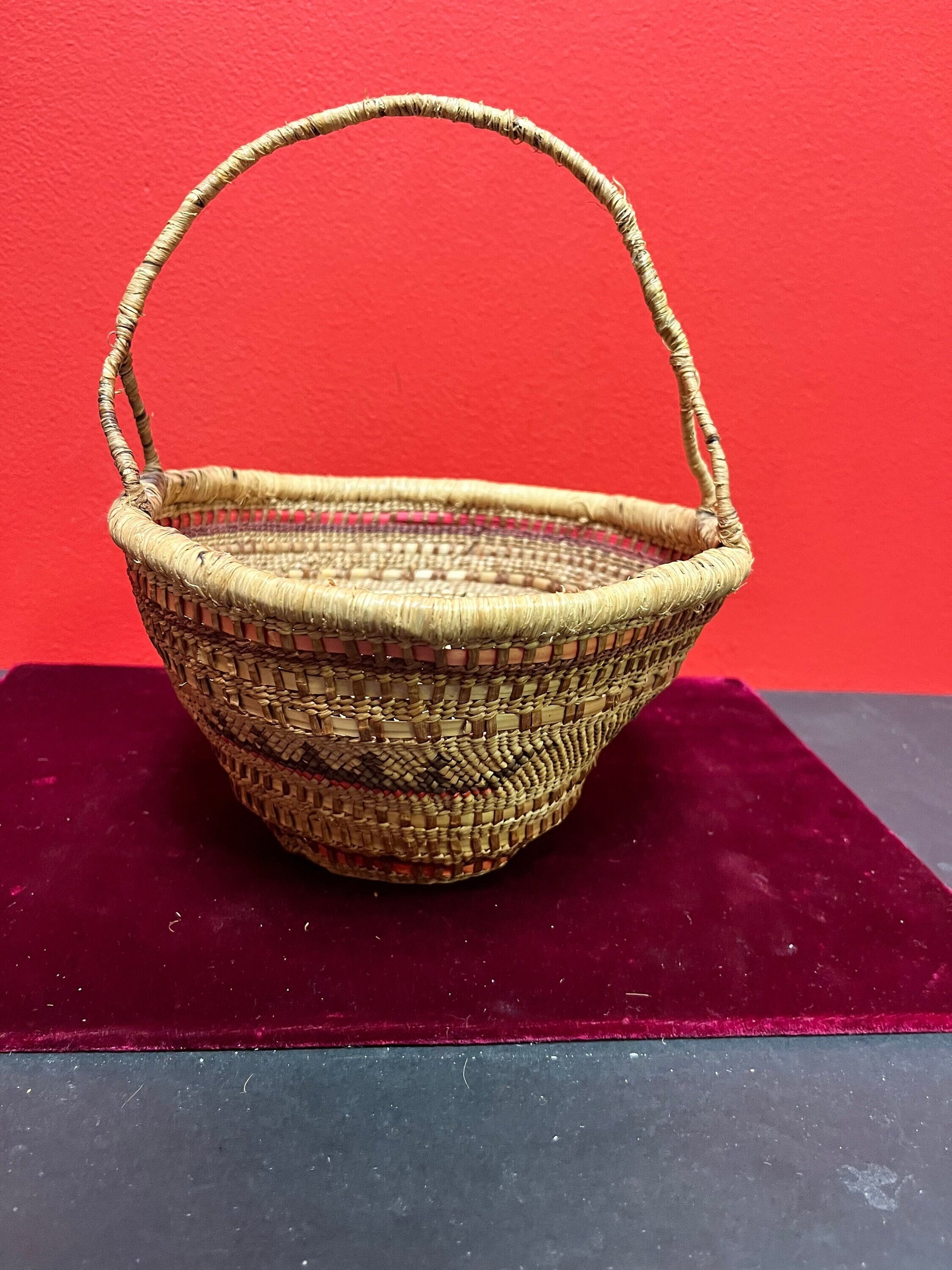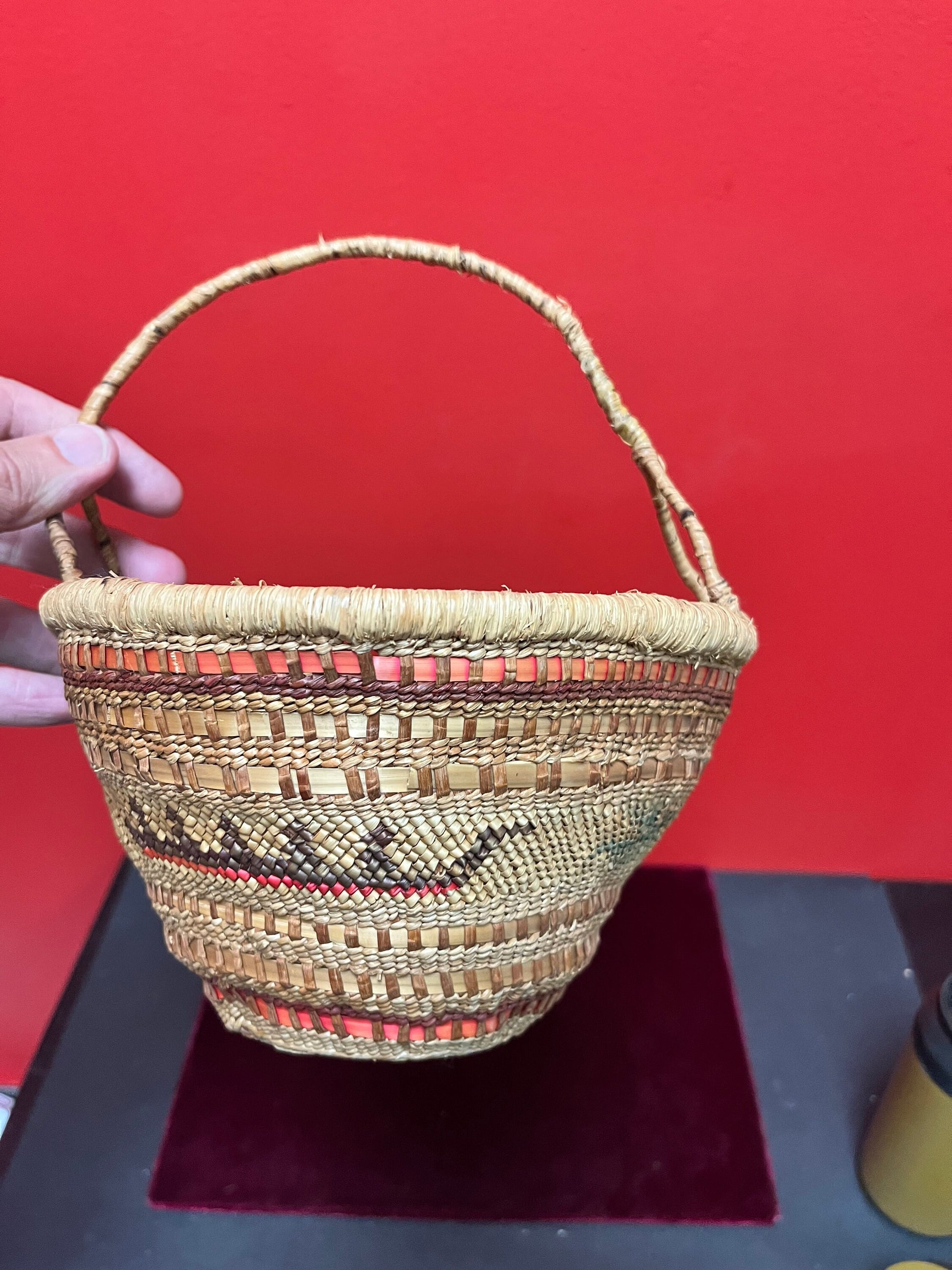 Stunning 8 x 10 high indigenous Canadian native antique woven basket with delicious handle wow