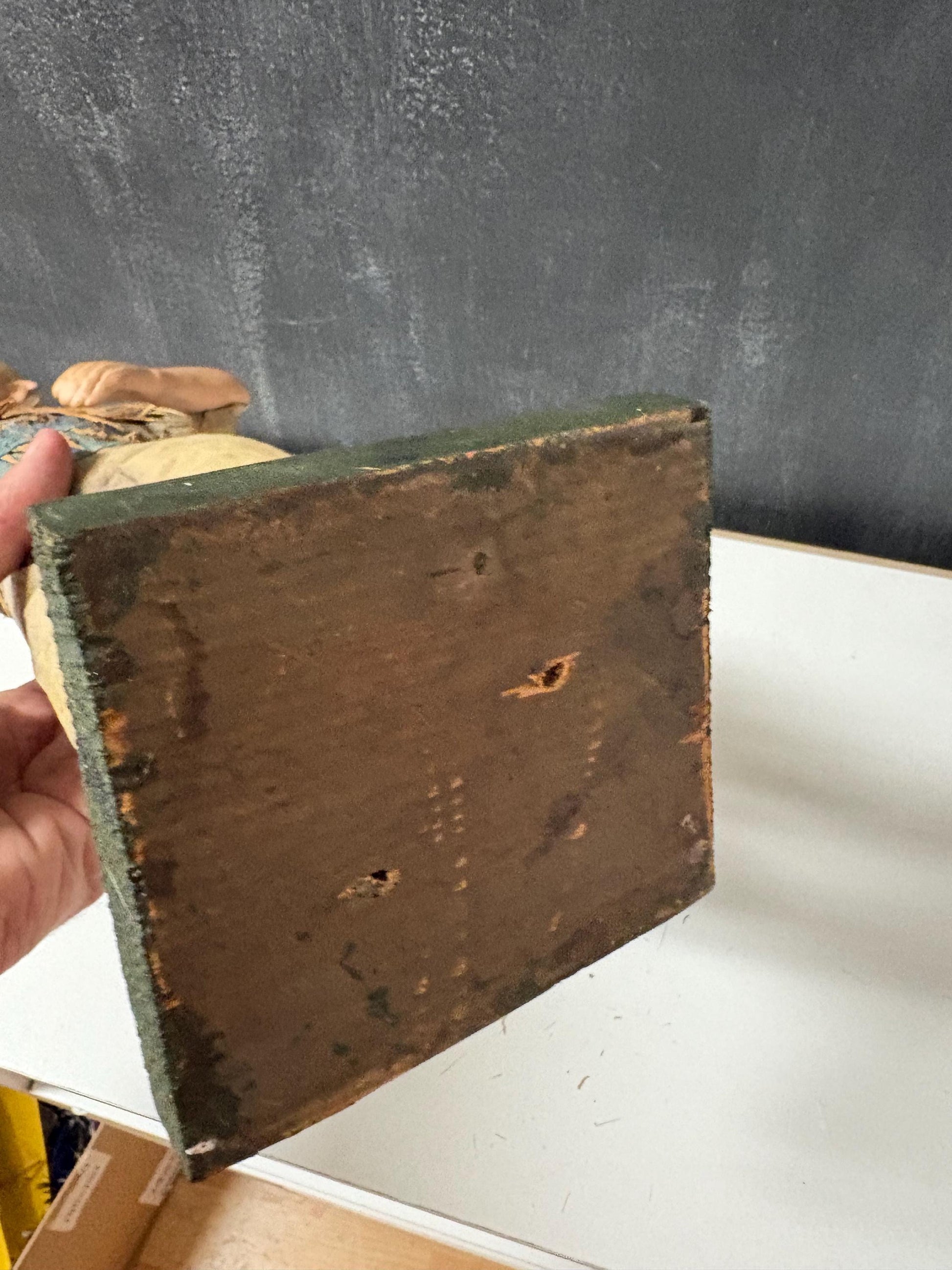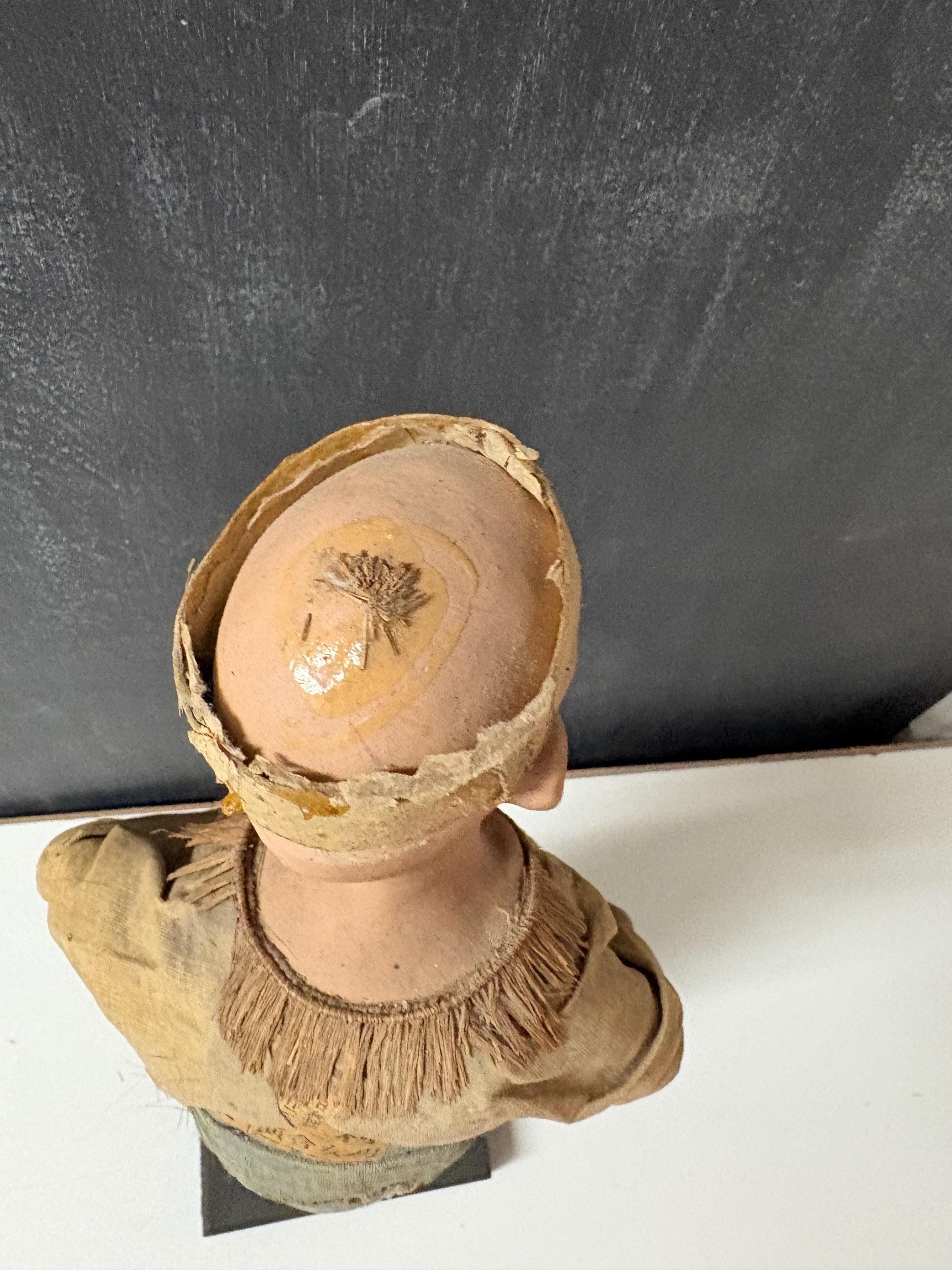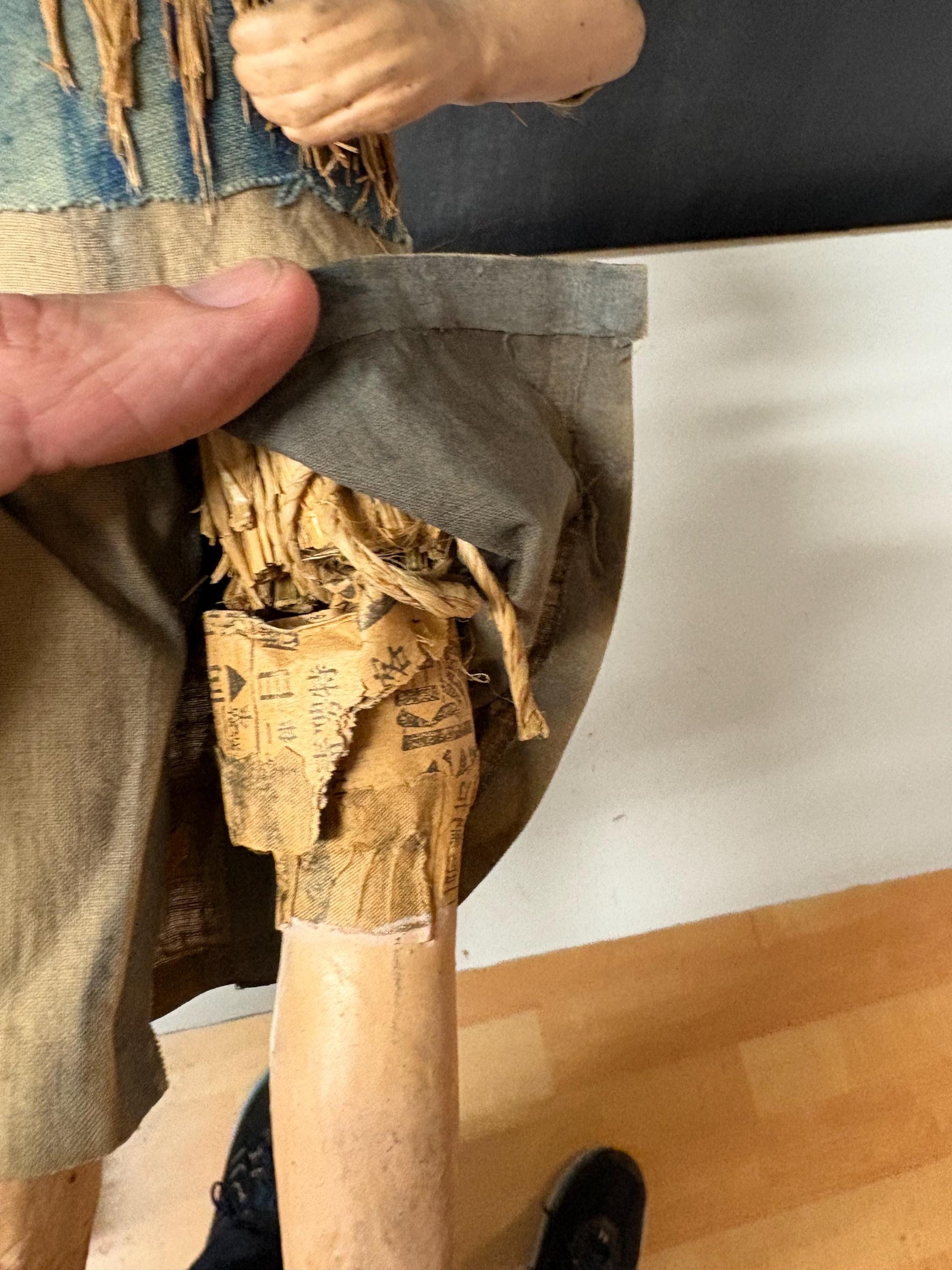 Stunning Chinese 18th century porcelain newspaper, straw and cloth statue of a man on wood stand wow - 15 inches tall