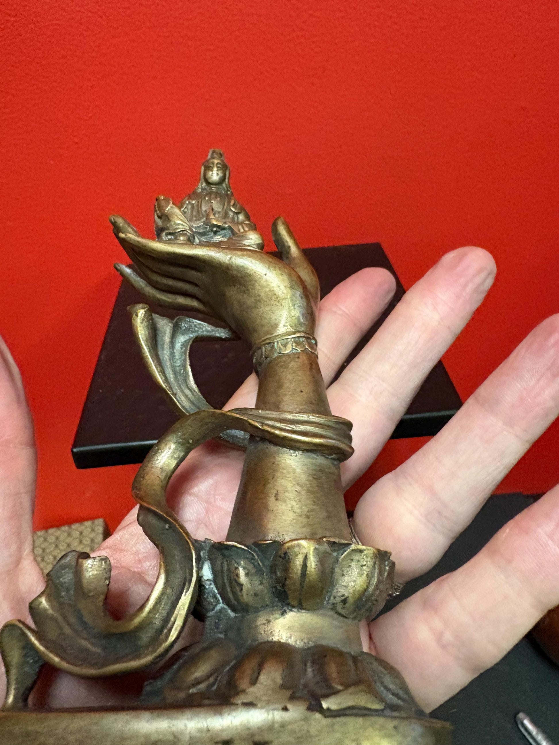 Stunning Chinese antique signed 7 inch tall bronze Quan yin on hand on lotus leaf great patina and fabulous piece