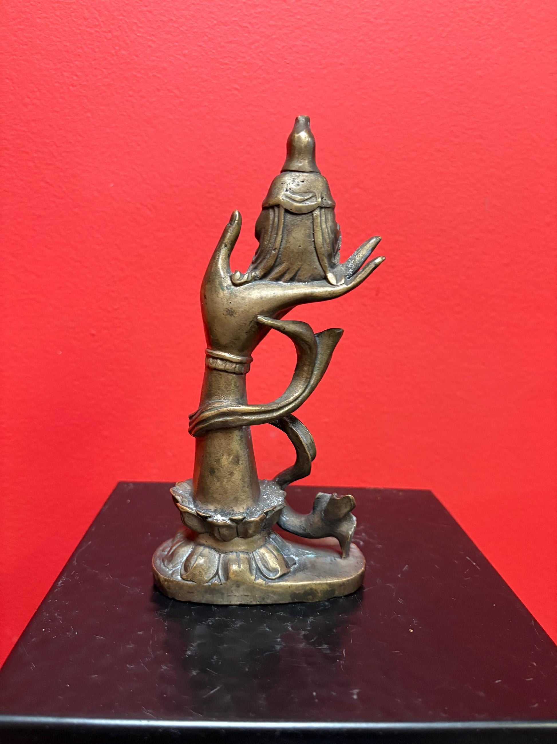 Stunning Chinese antique signed 7 inch tall bronze Quan yin on hand on lotus leaf — great patina and fabulous piece