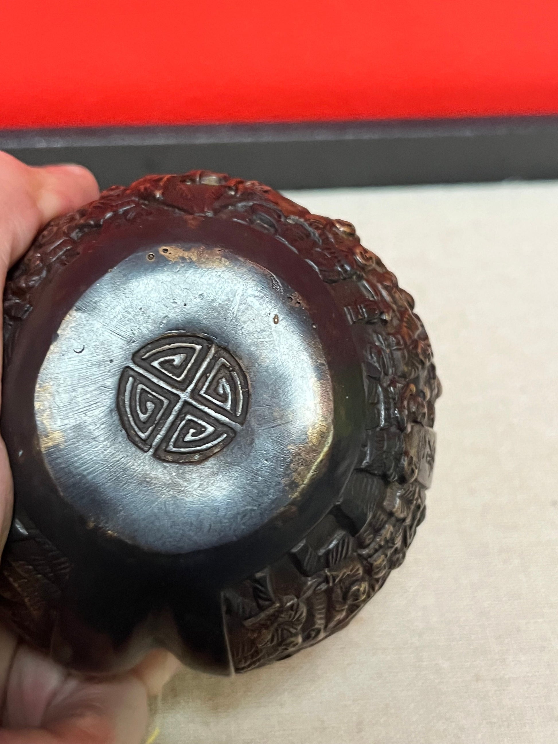 Stunning Chinese antique signed bronze birthday celebration peach with Confucius scene signed with Great Patina - 4 inches high- 175 grams
