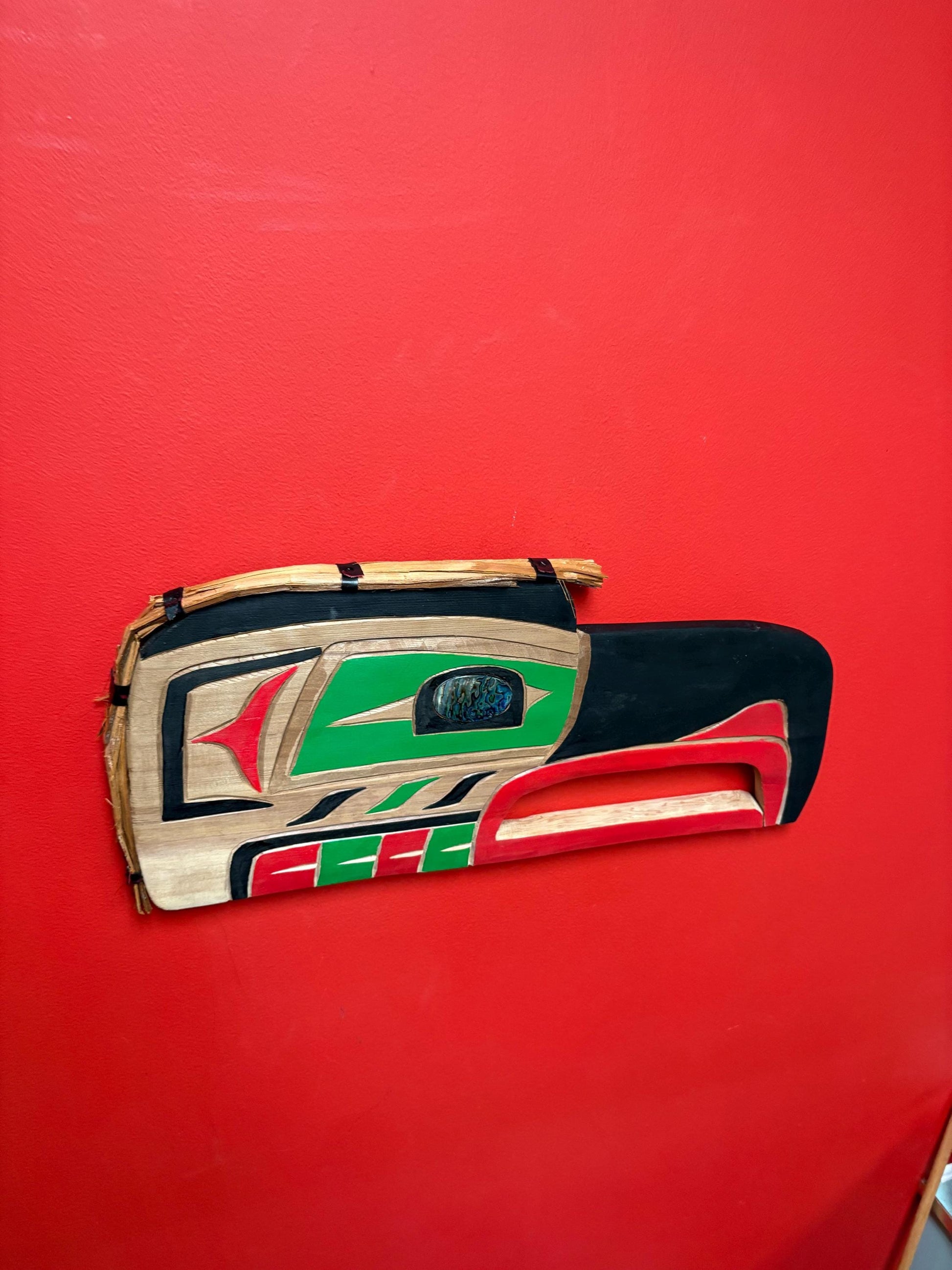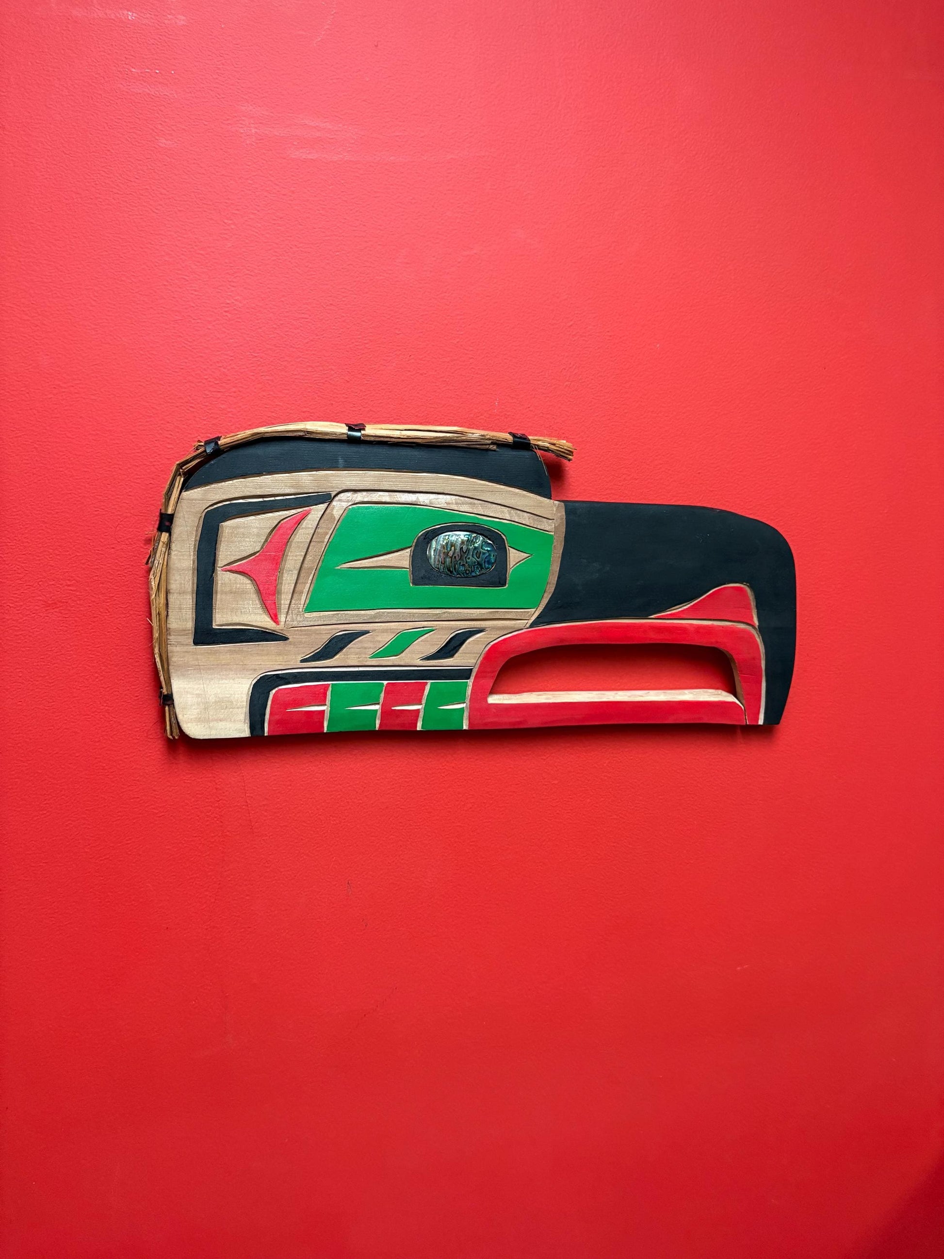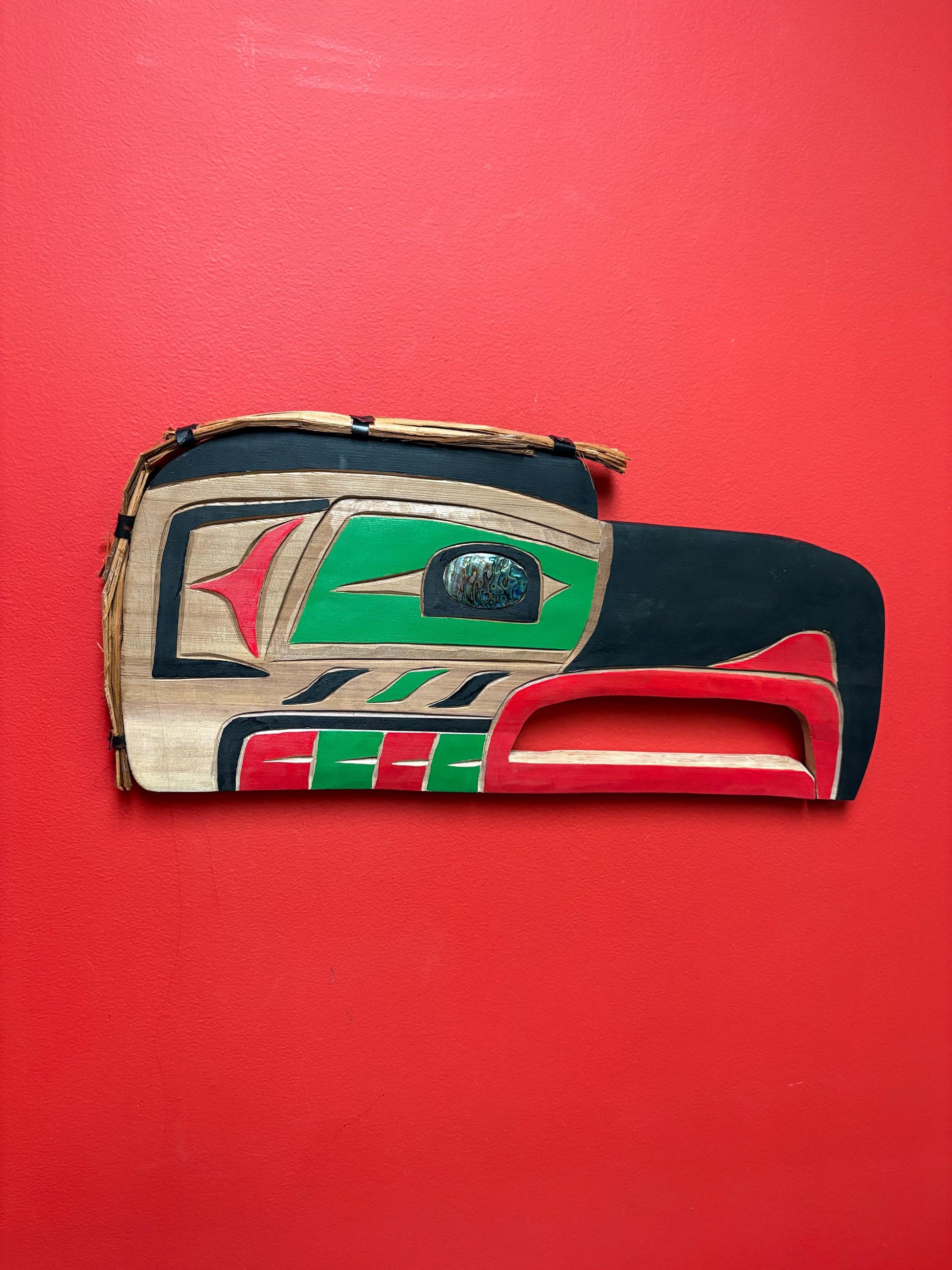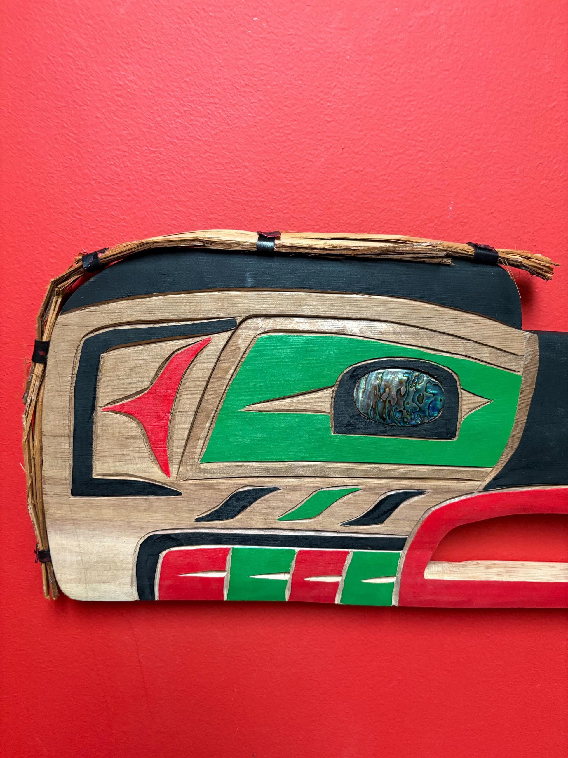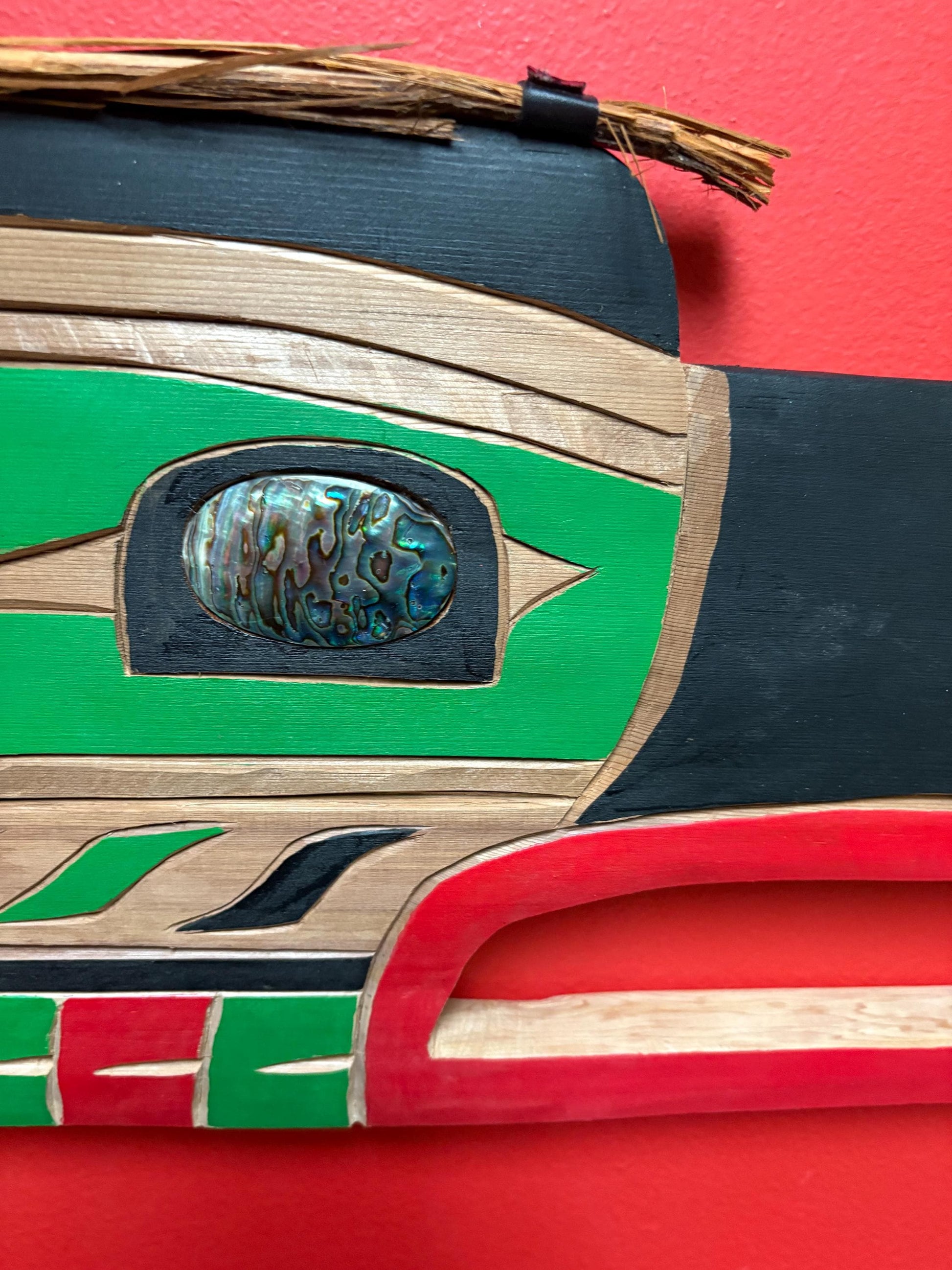 Stunning indigenous first nation Pacific Northwest coast signed Bradley Joseph Jr Raven plaque with stunning abalone eye - 19 x 9 1/2 high