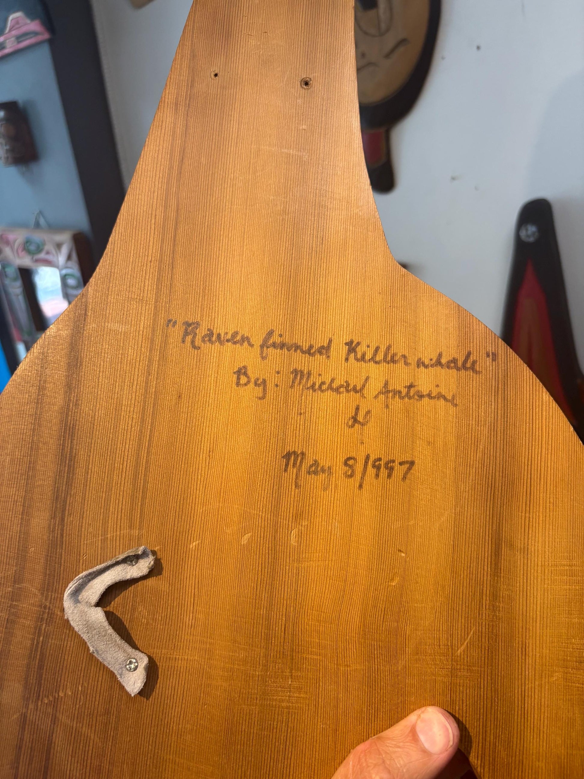 Stunning indigenous first nations, Pacific Northwest coast signed 28 x 12” wide cedar killer whale transformation plaque with abalone — wow - RS