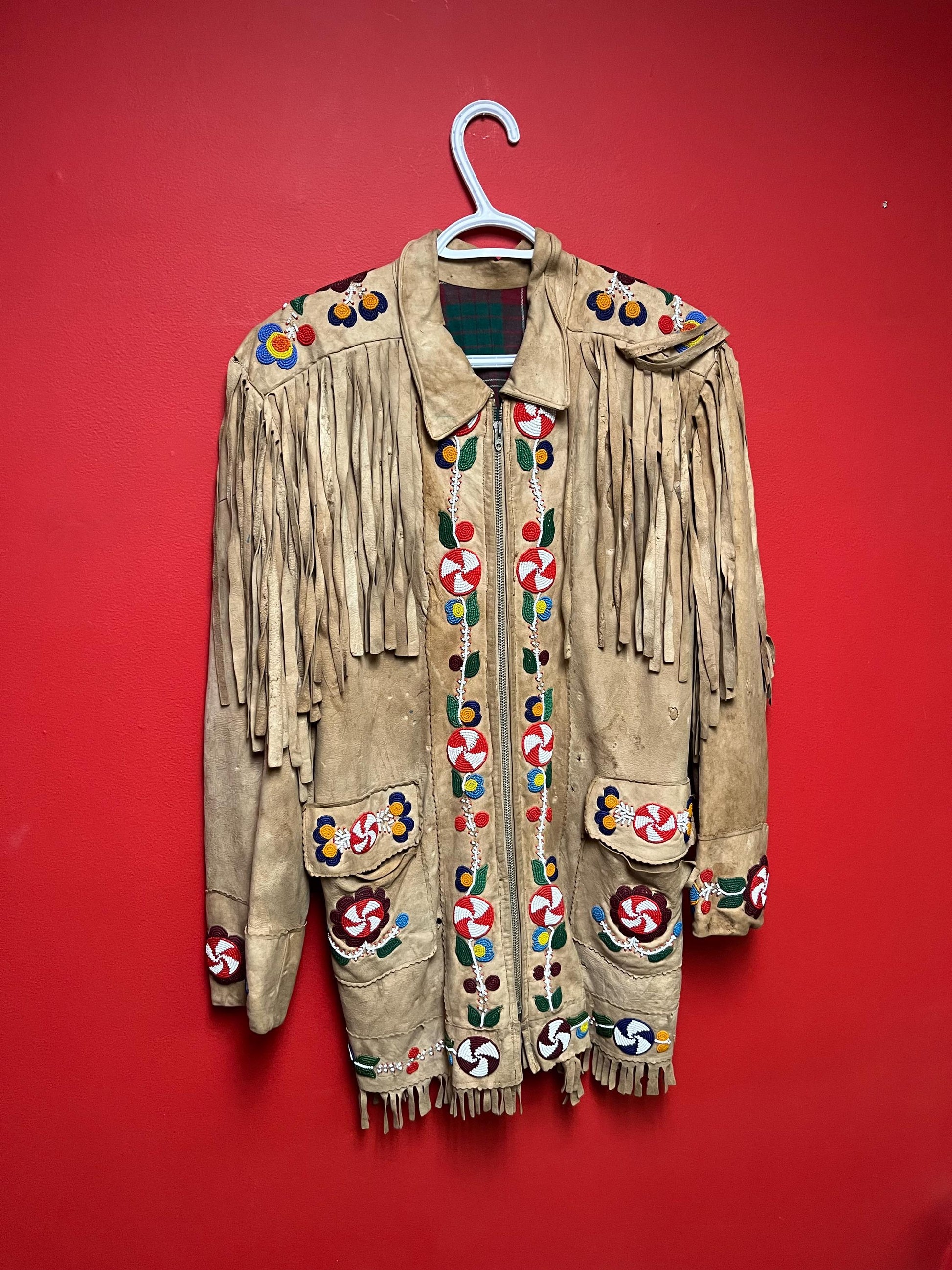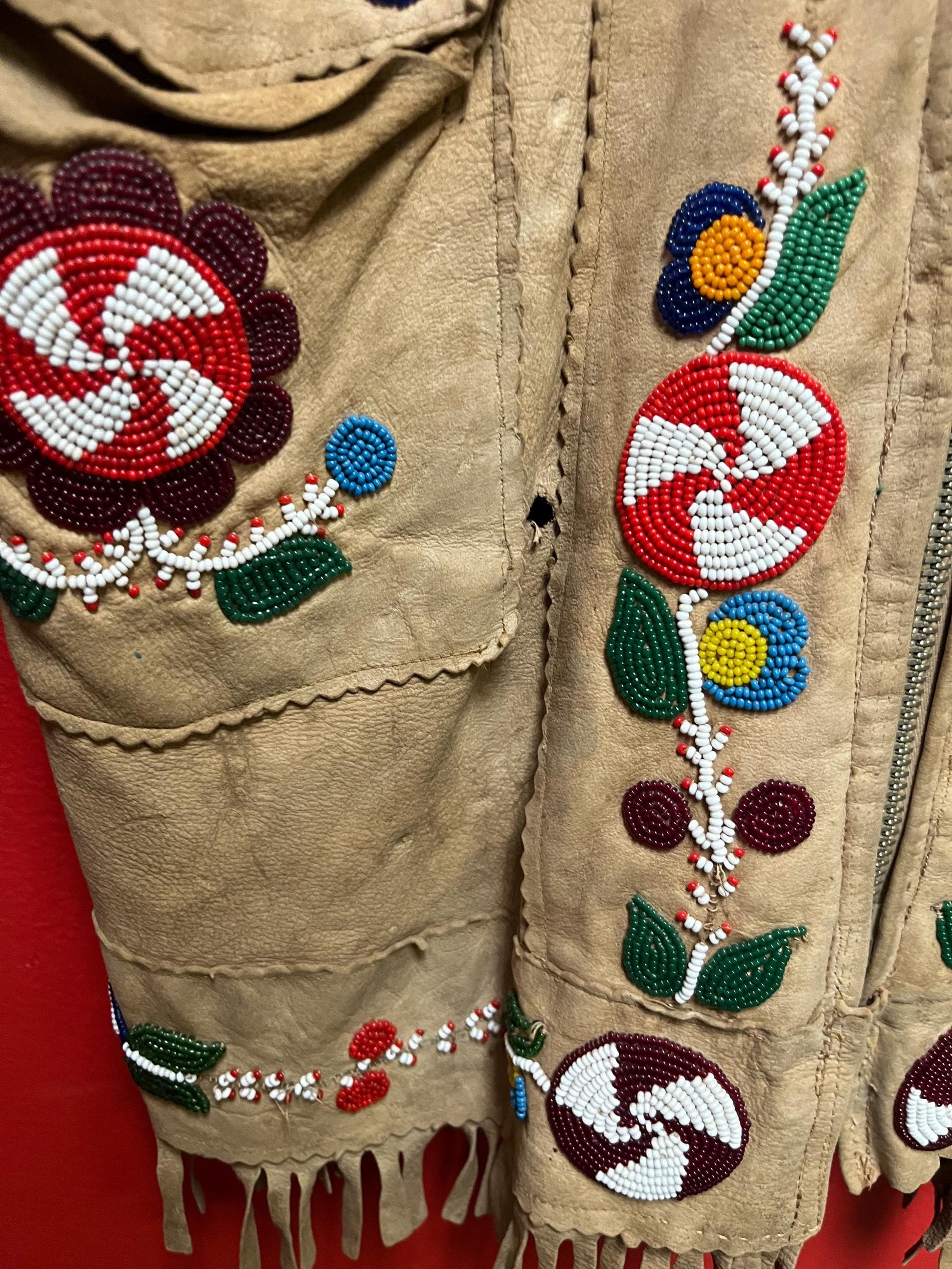 Stunning, indigenous native antique beaded jacket approximately 32 inches long and 16 inch chest medium to large minor damage see photo