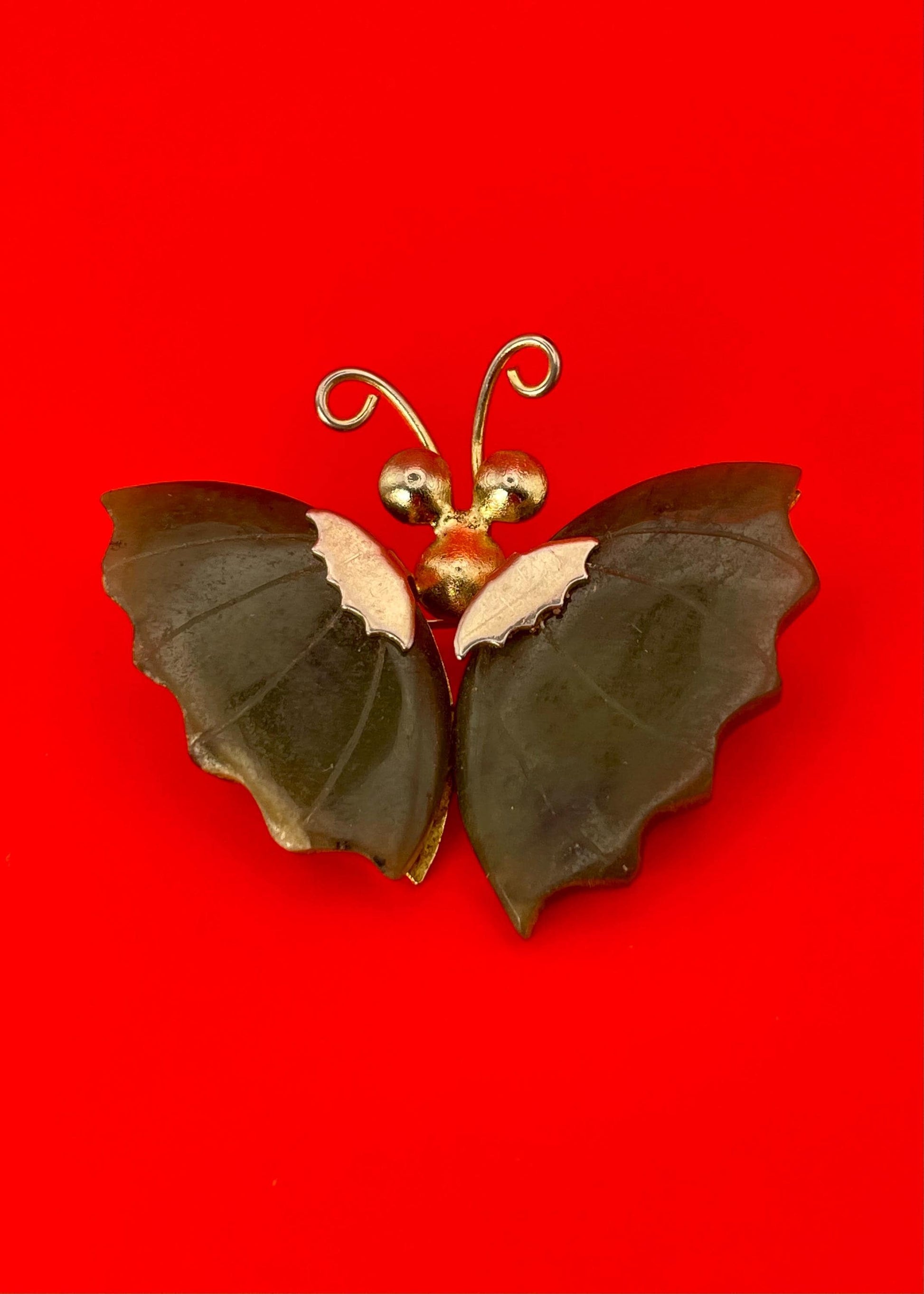 This exquisite butterfly brooch features gold accents and polished jade wings .