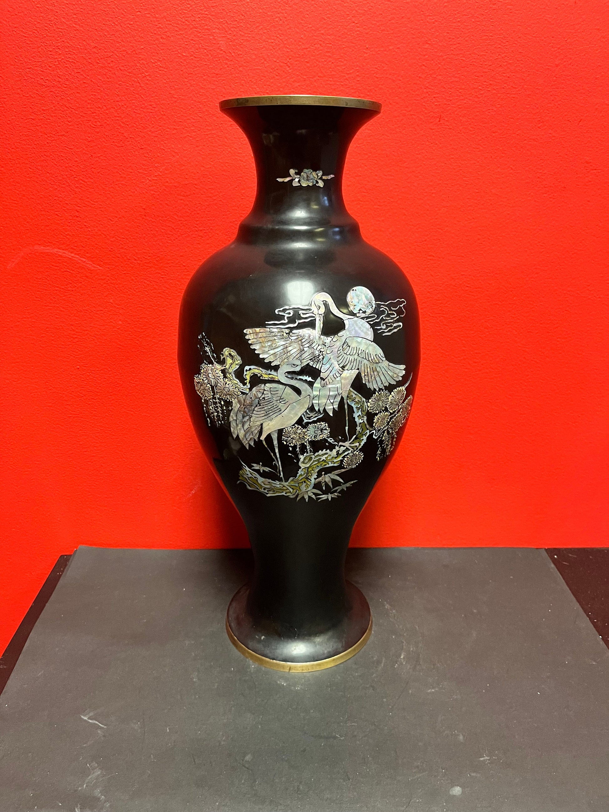Stunning Japanese brass lacquer and mother of pearl vase great imagery 19 inches tall statement piece