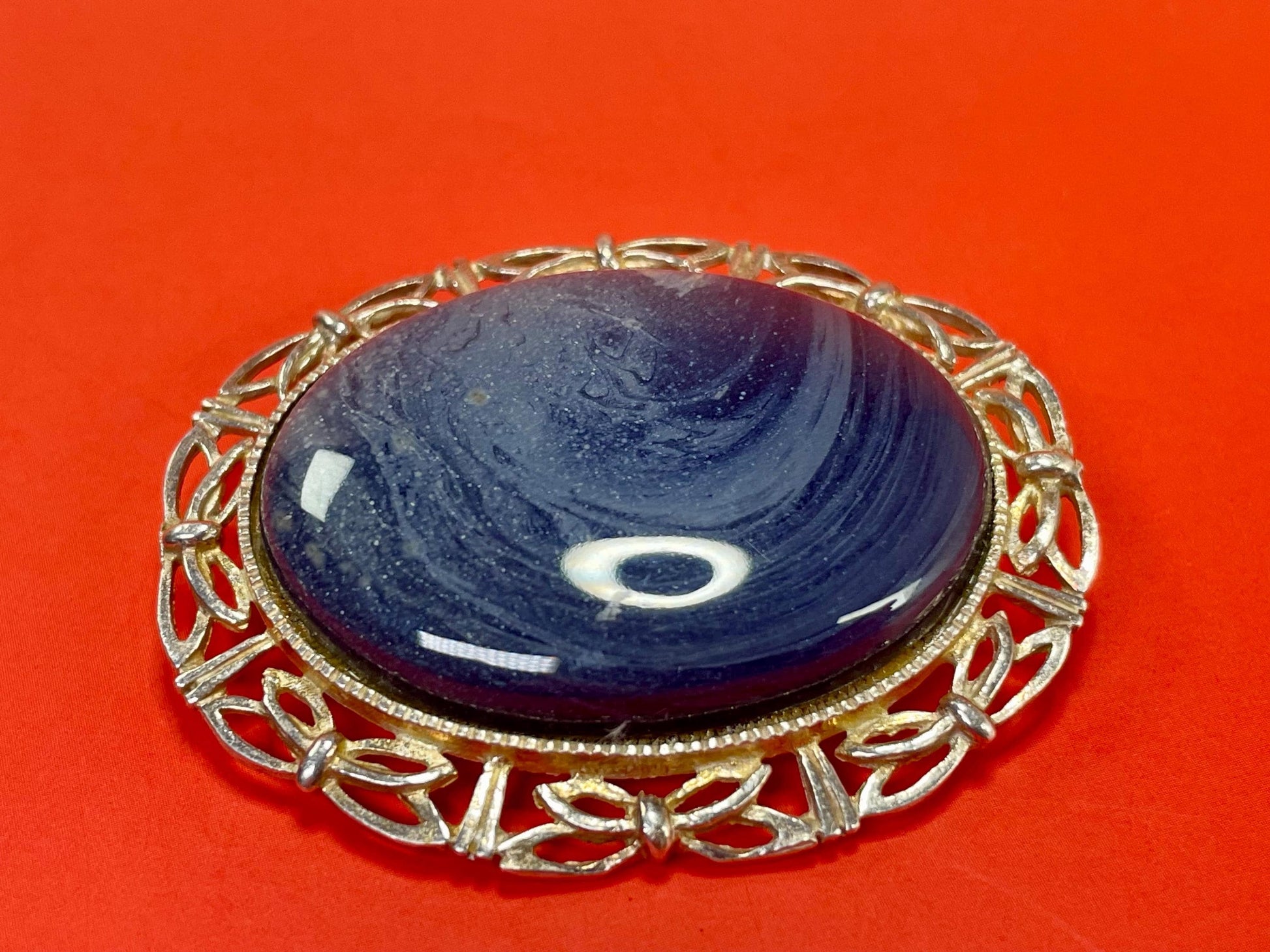 This gorgeous brooch features a swirling shiny blue stone surrounded by an intricate sterling silver frame with butterflies (or bows).