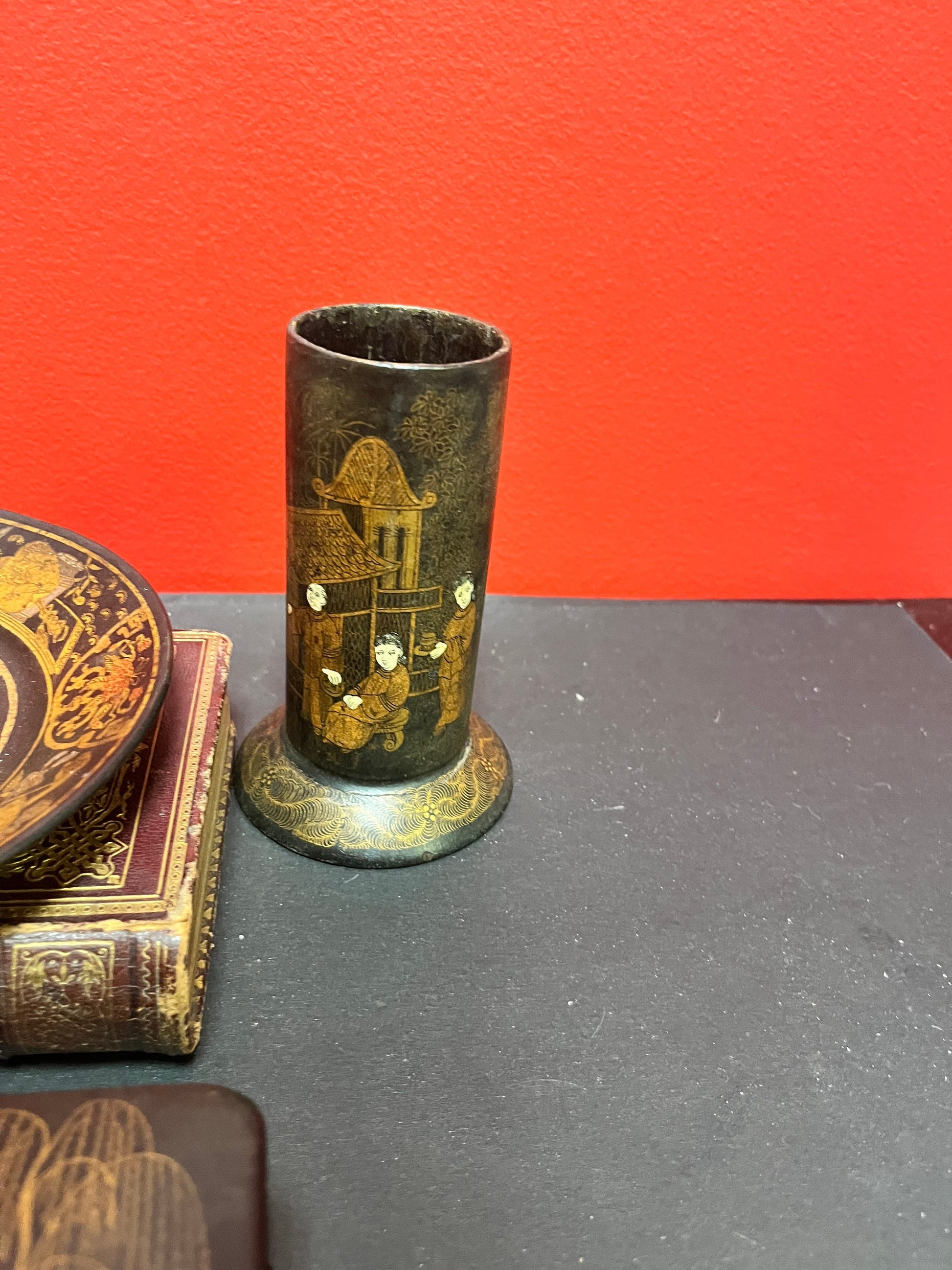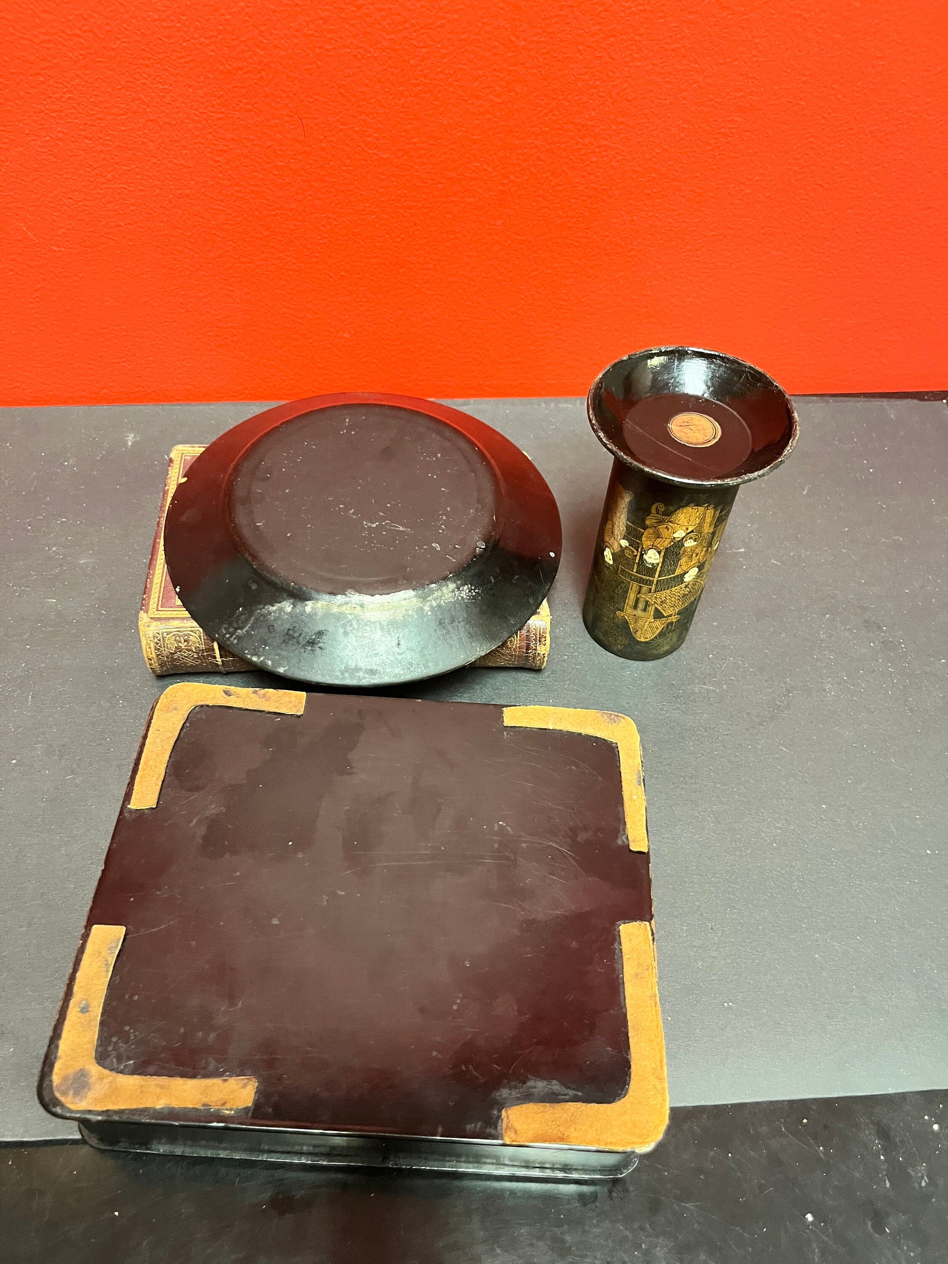 Three pieces of beautiful south East Asian lacquer ware with gilt decoration box dish and vase great gifts