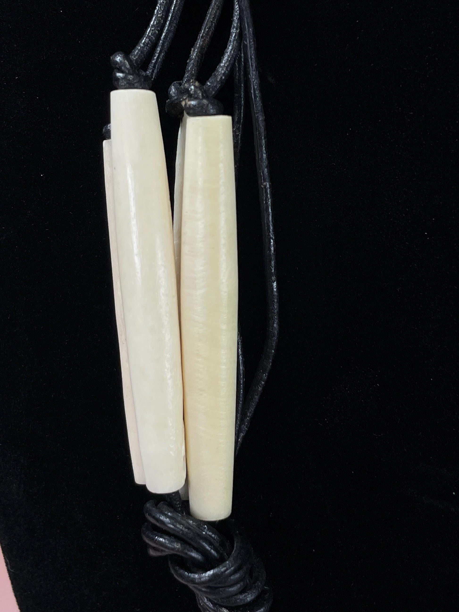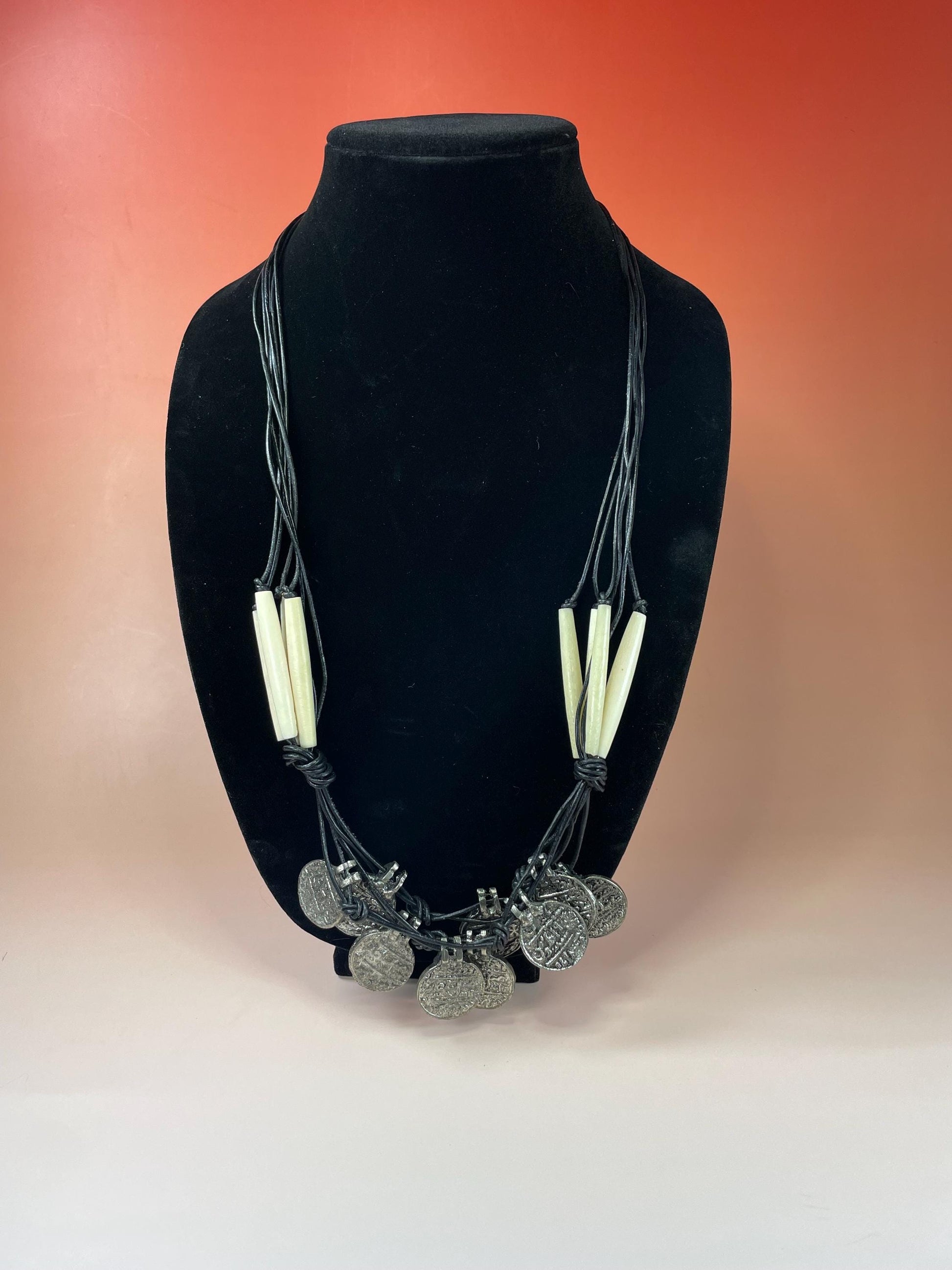 Make a statement with this unique 31 inch necklace, crafted with bone beads, coins and leather cording for a striking tribal inspired look.