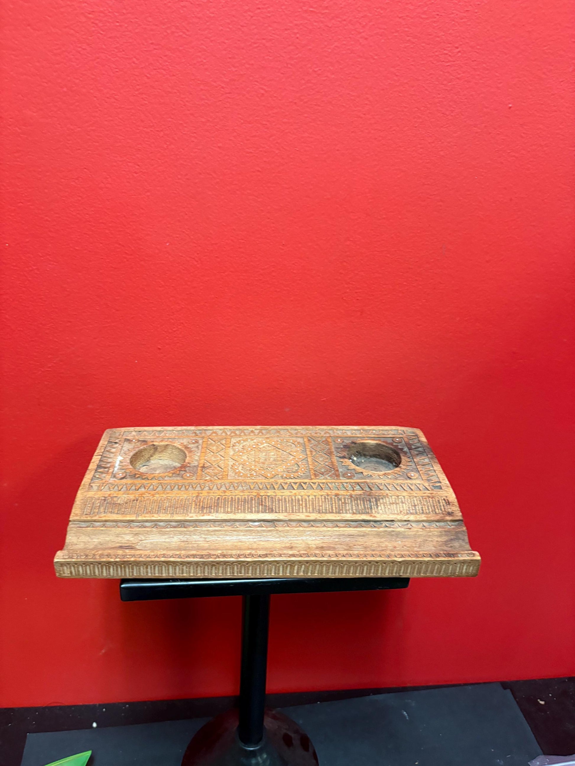Unique heavily carved antique wooden inkwell — missing bottles - 11 x 7” and holes 1.5 inch wide— great value