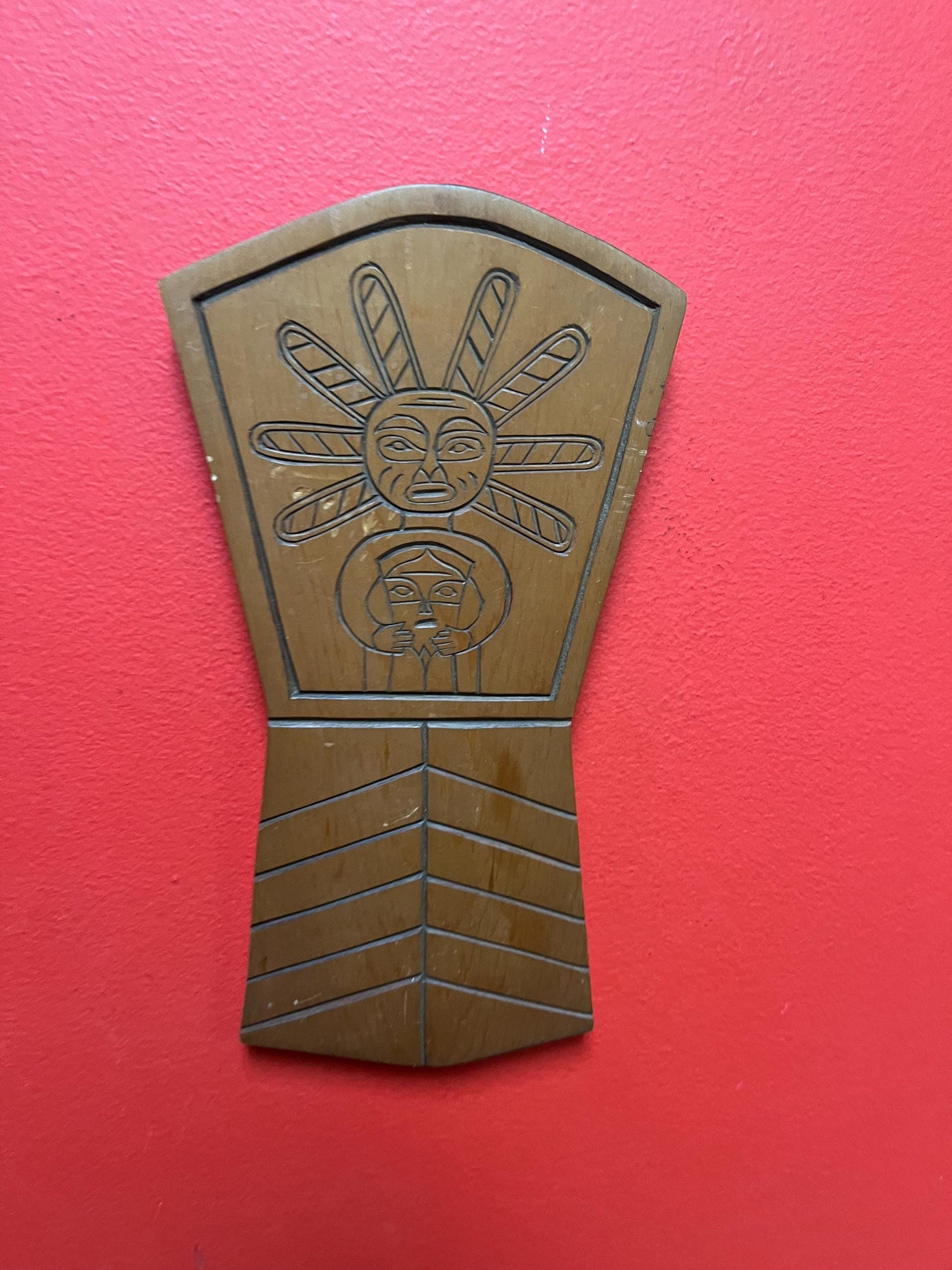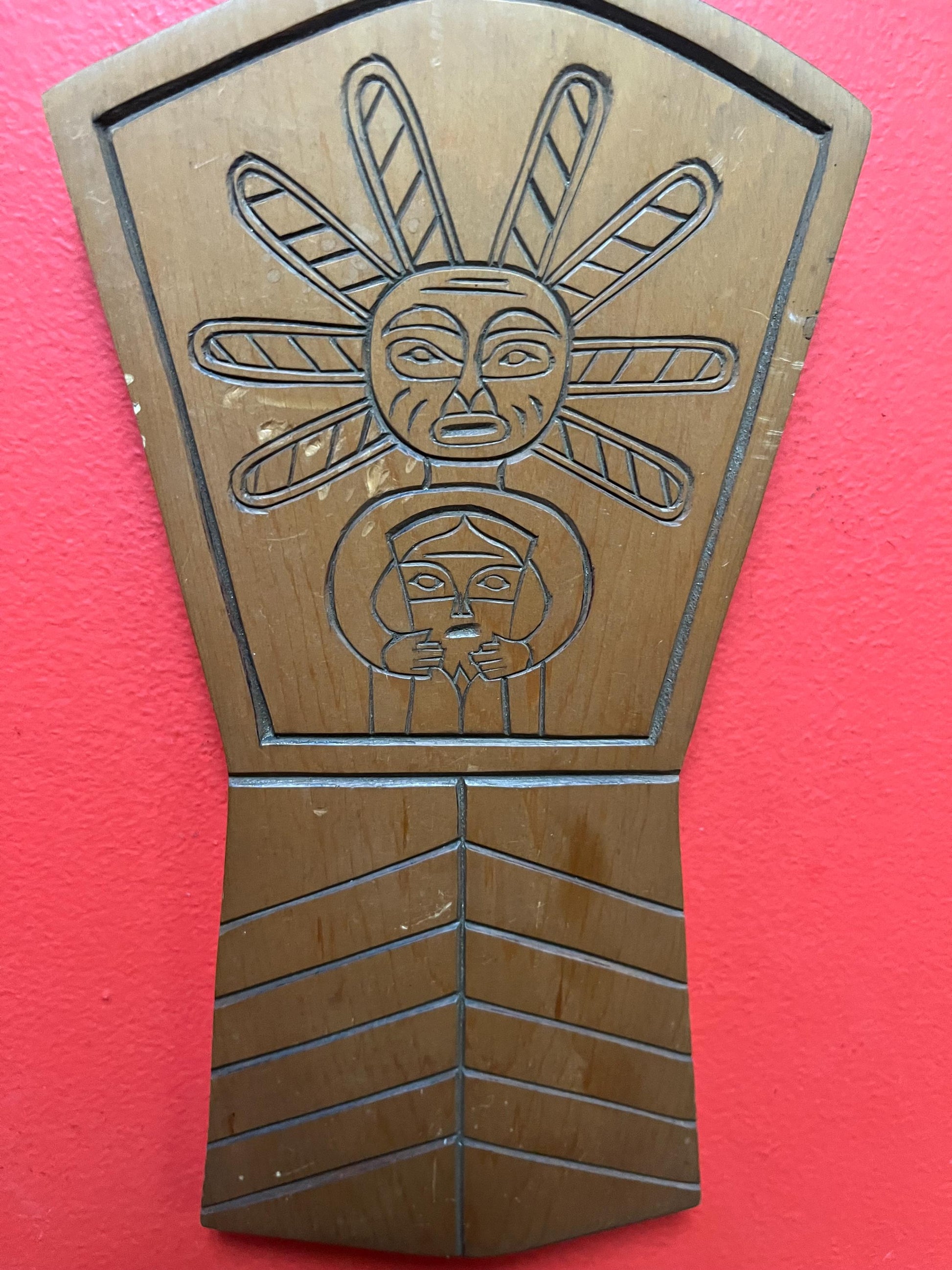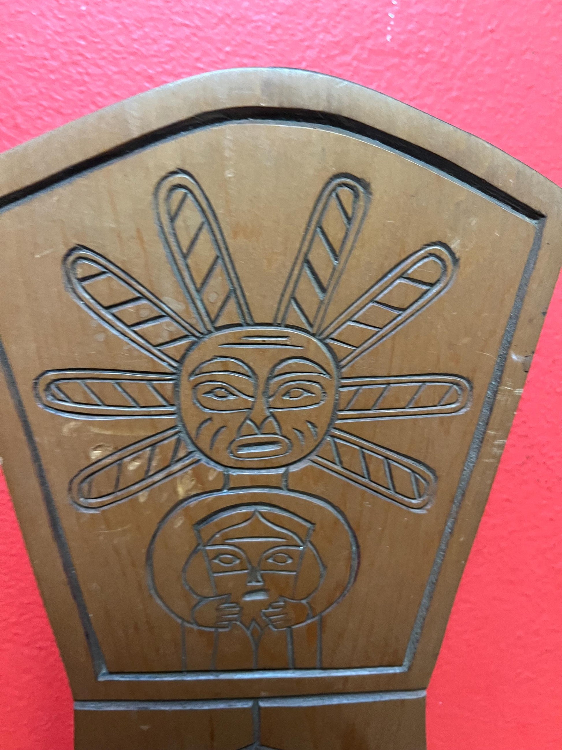 Unusual indigenous first nation pacific northwest coast Cedar plaque 11 x 5 wide sun mask holding copper great detail, ready to hang