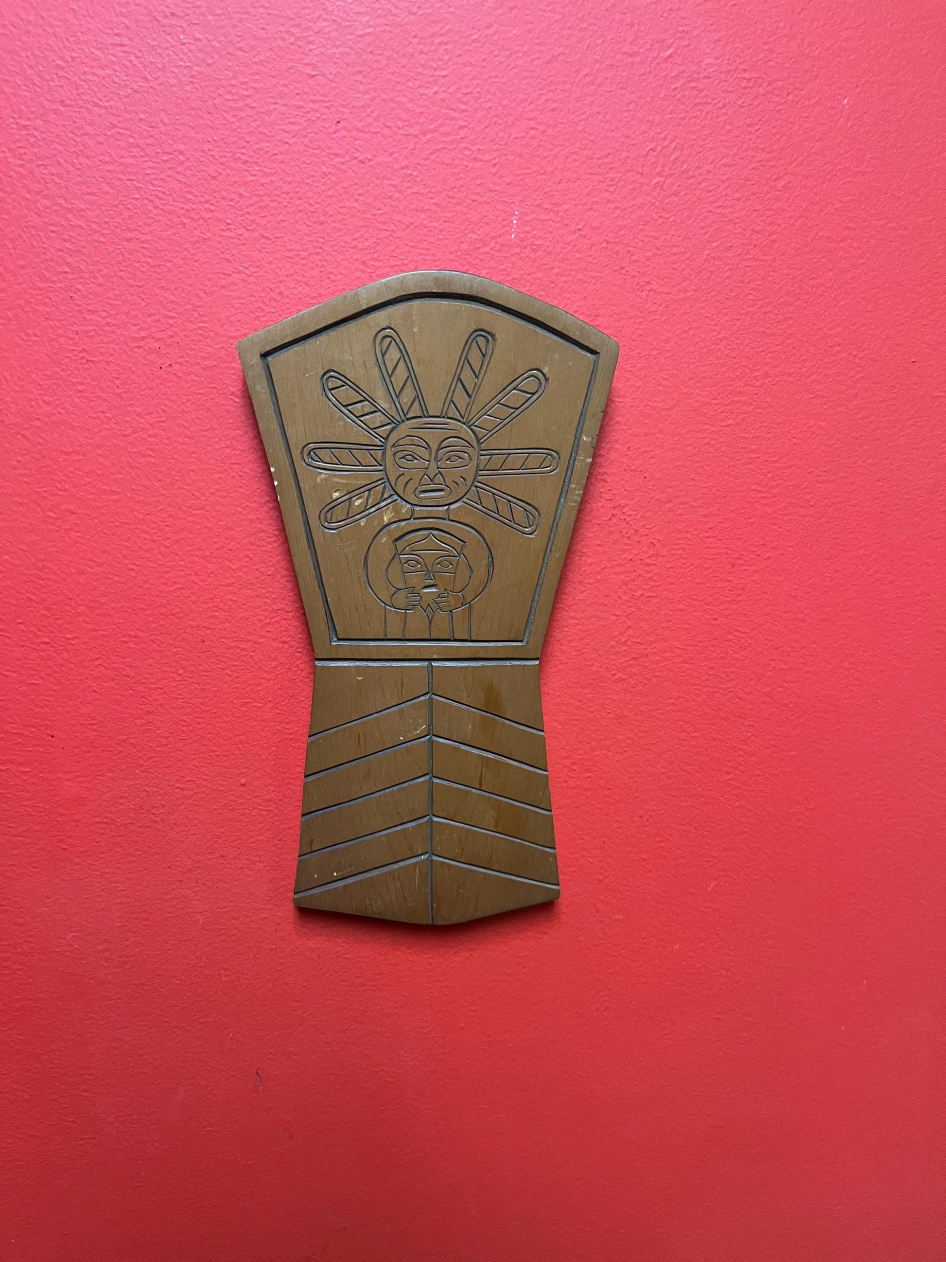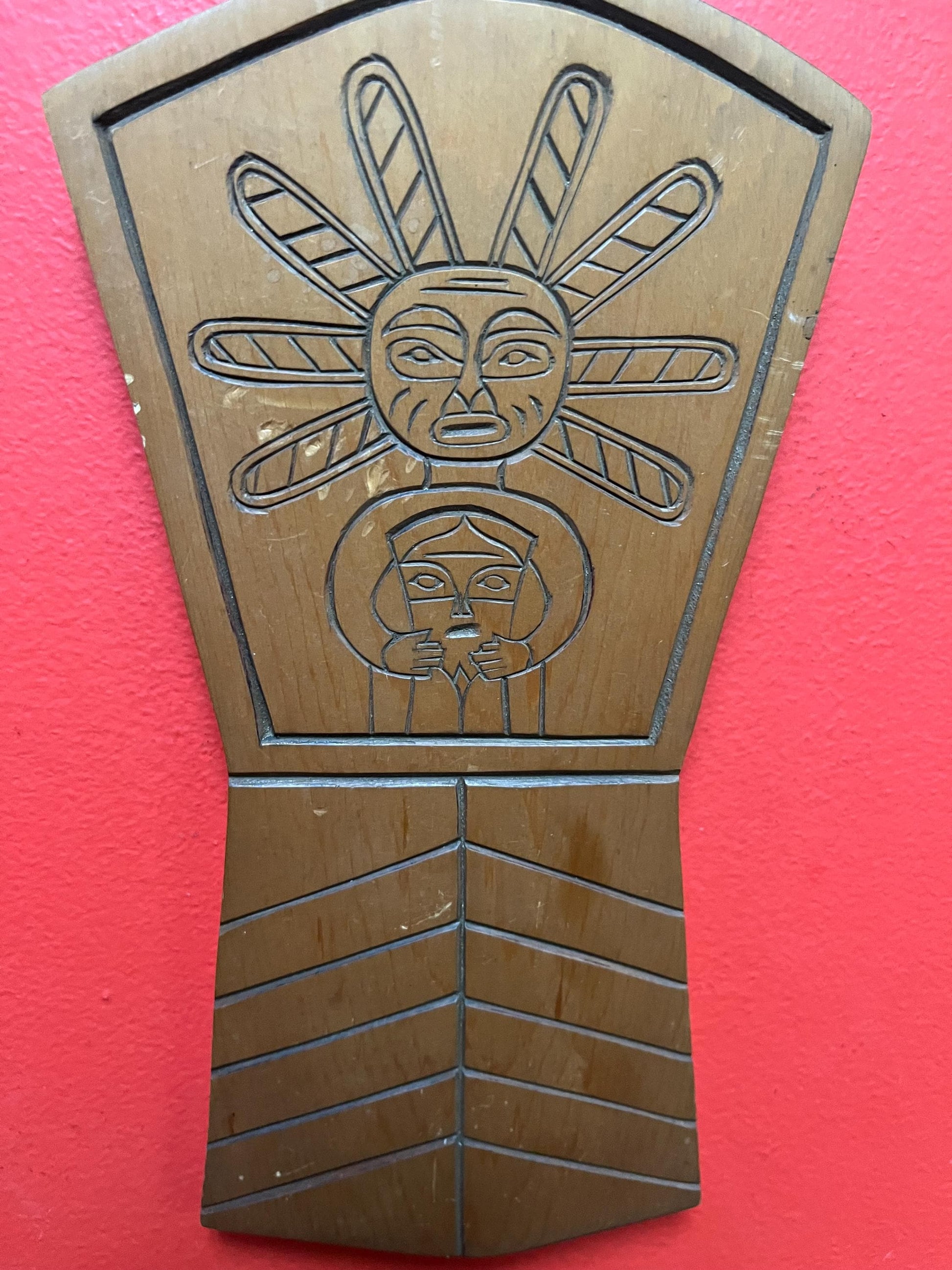 Unusual indigenous first nation pacific northwest coast Cedar plaque 11 x 5” wide — sun mask holding copper — great detail, ready to hang —