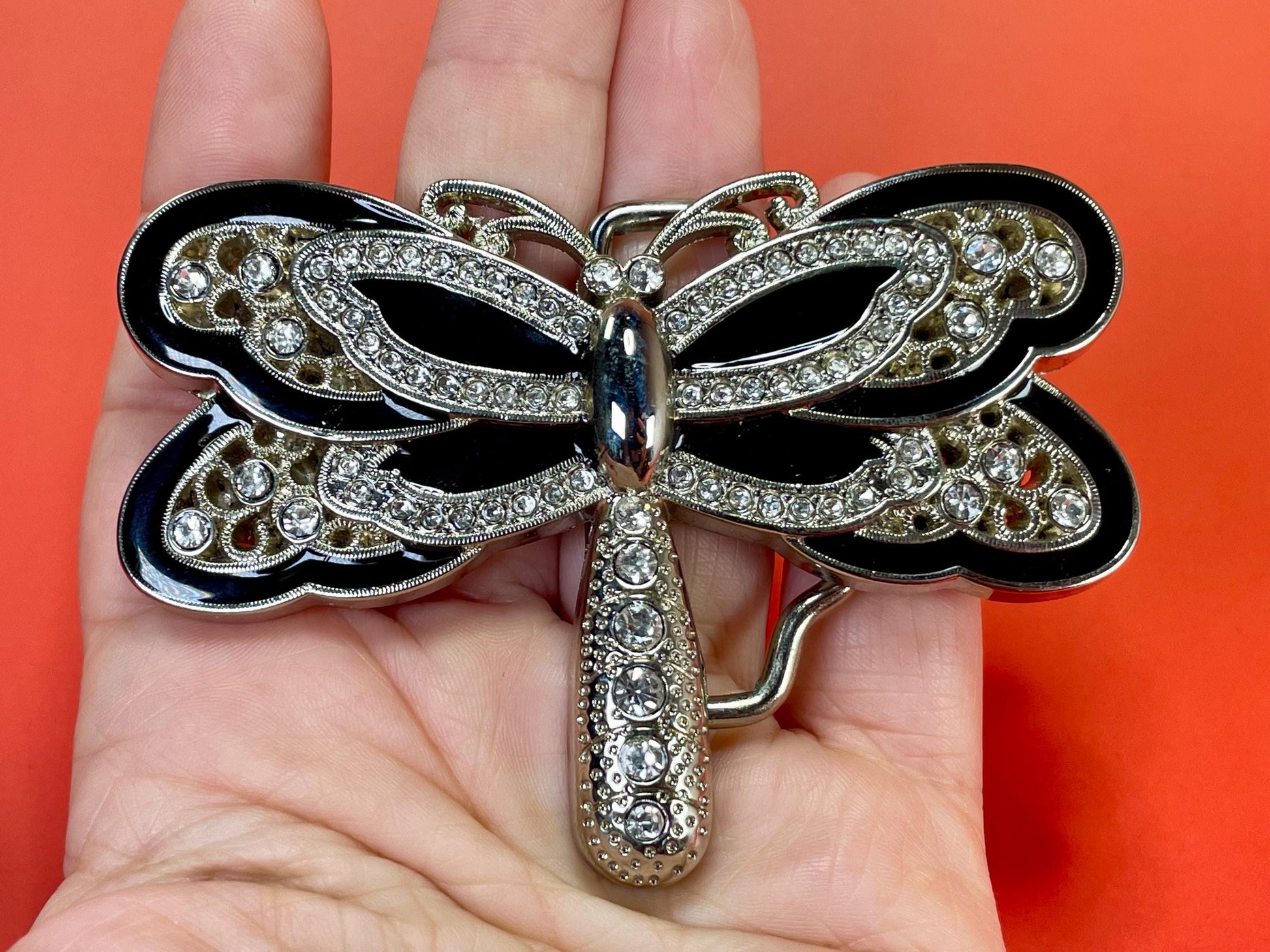 This awesome Belt Buckle features a black, untested silver and rhinestone dragonfly design. measuring 3.5 inches across. Heavy Metal.