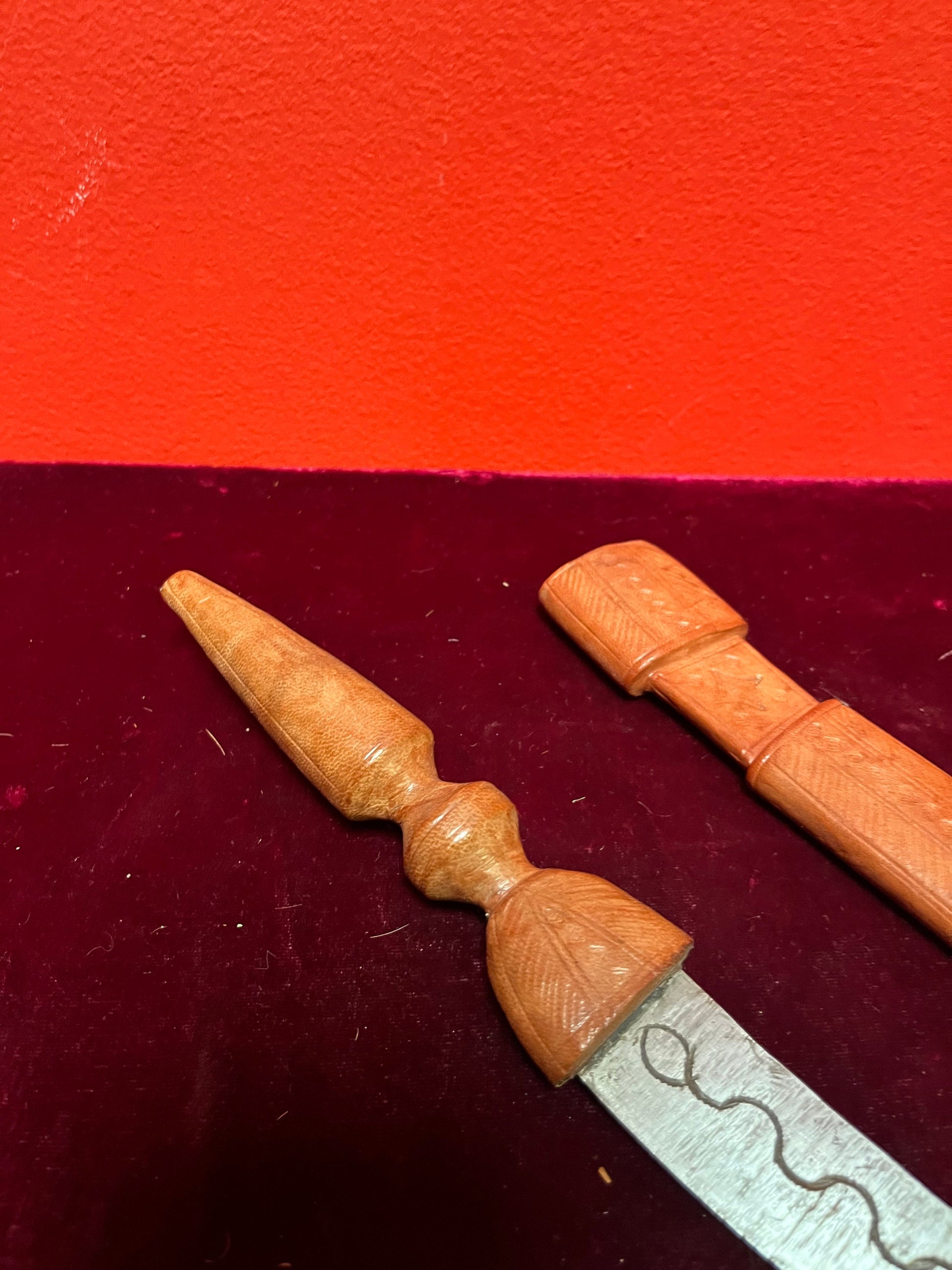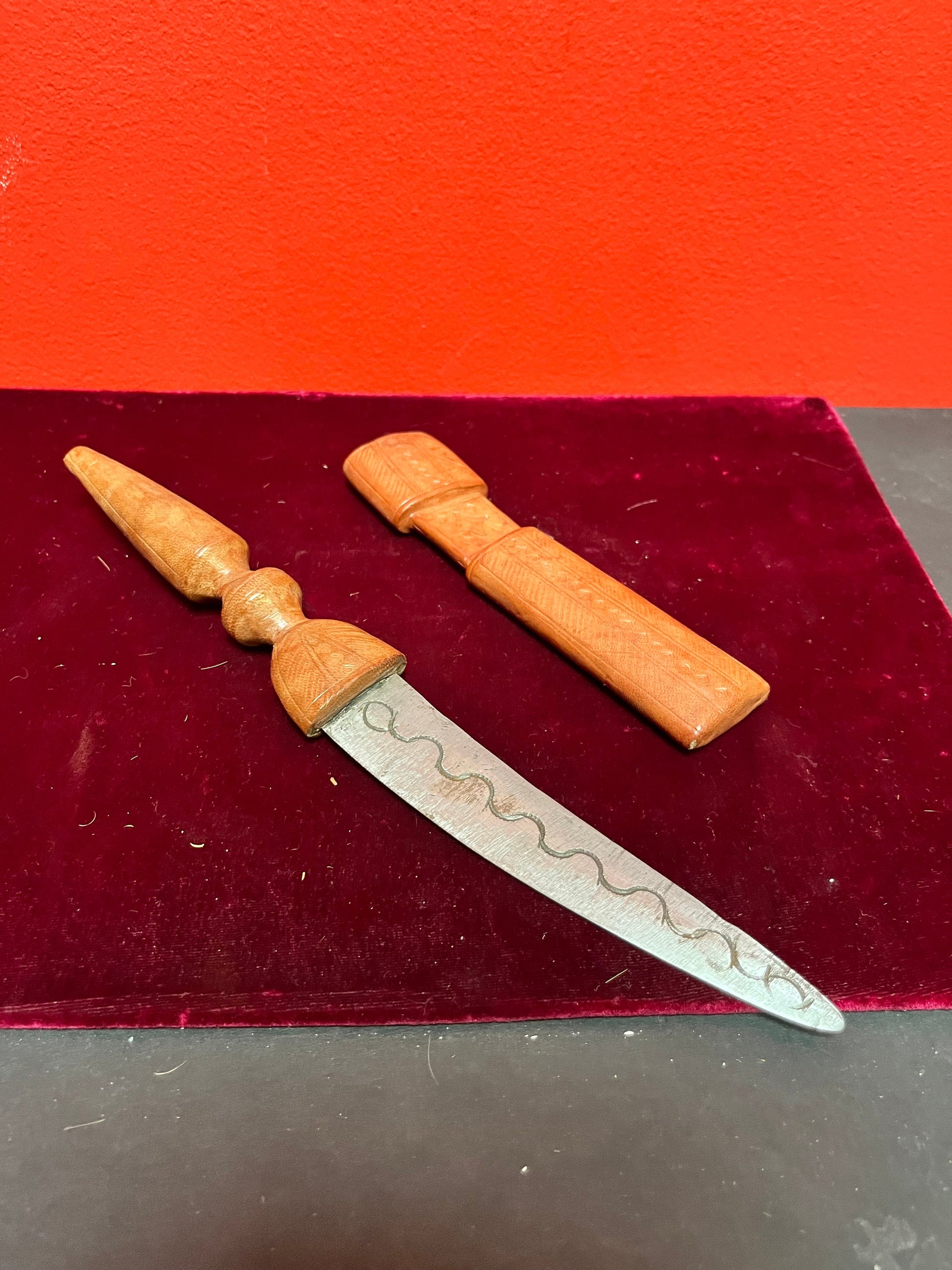 Very nice 11 inch long leather and steel knife in sheaf older and fairly sharp