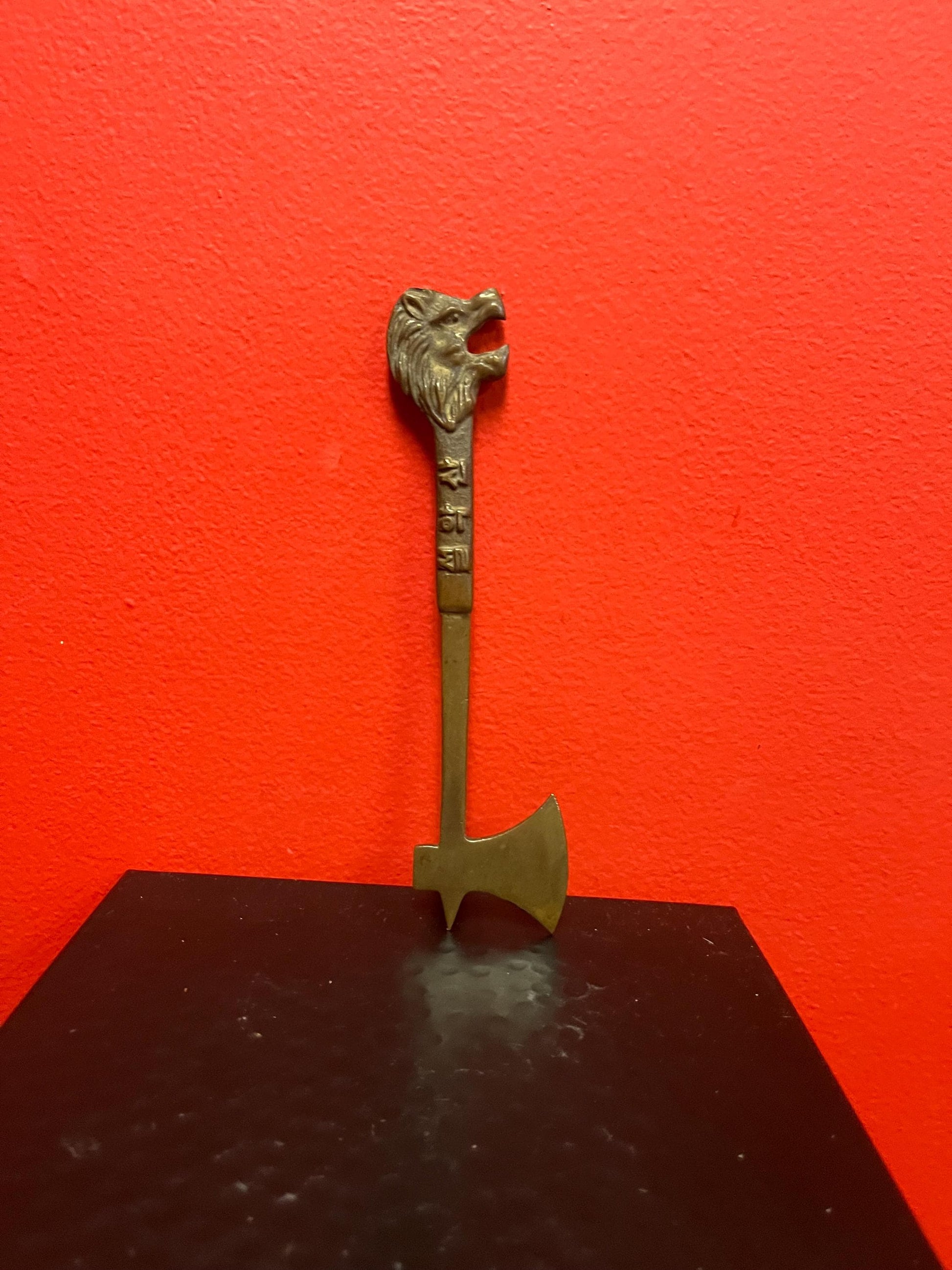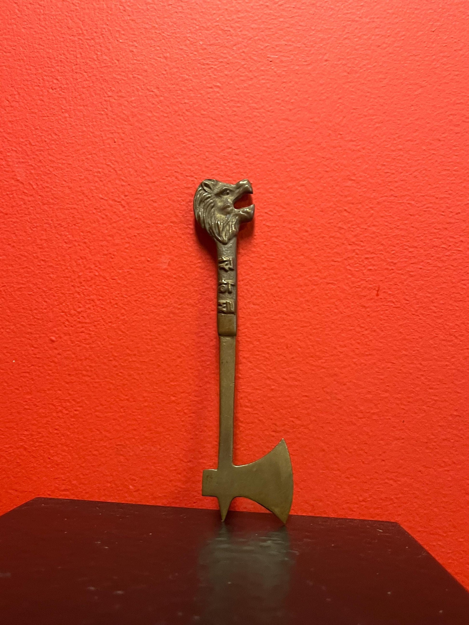 Very rare small antique Korean bronze 7 inch tall tool with Lion head super cool piece and lovely patina and weight
