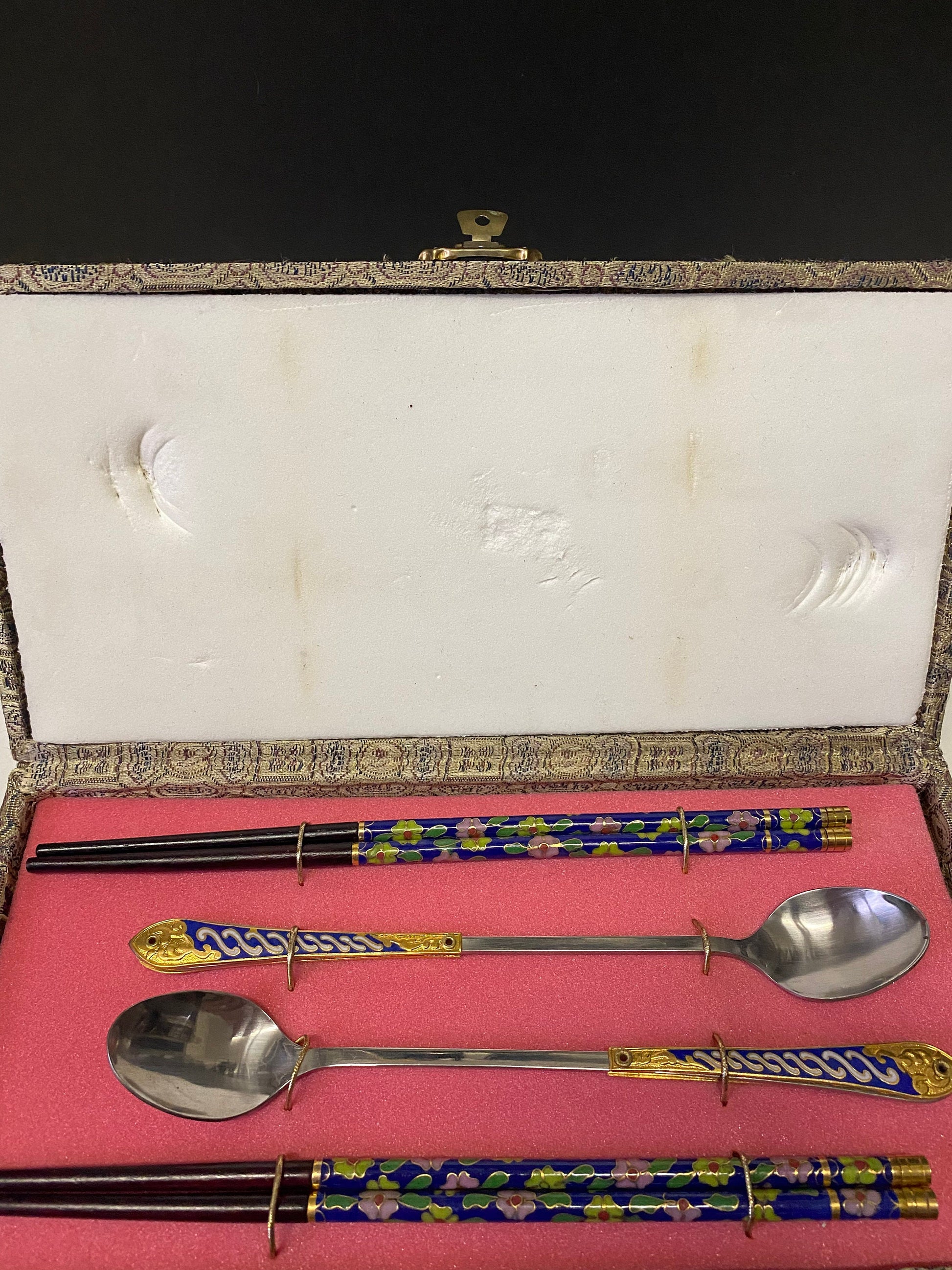 Vintage attractive cloisonné Chopstick and spoon set in original box ready to use!