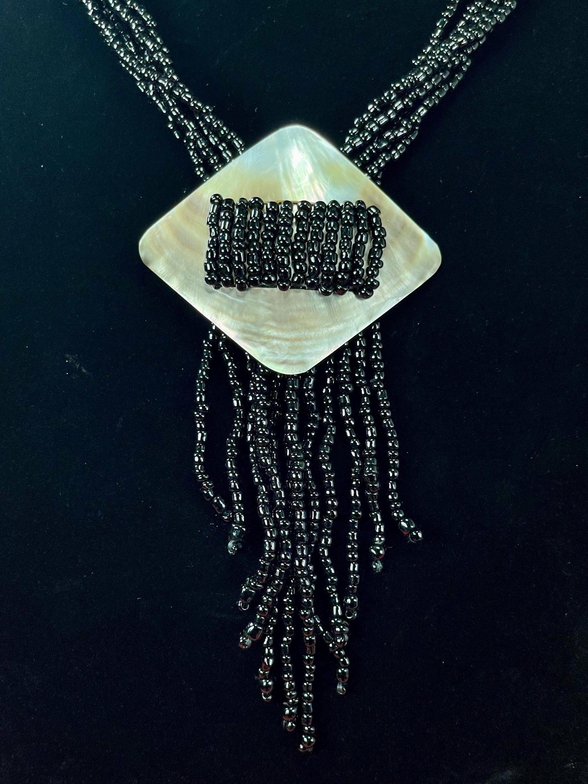 Gorgeous handcrafted, Vintage, approximately 17 inch black beaded necklace featuring a striking 4 inch shell pendant.