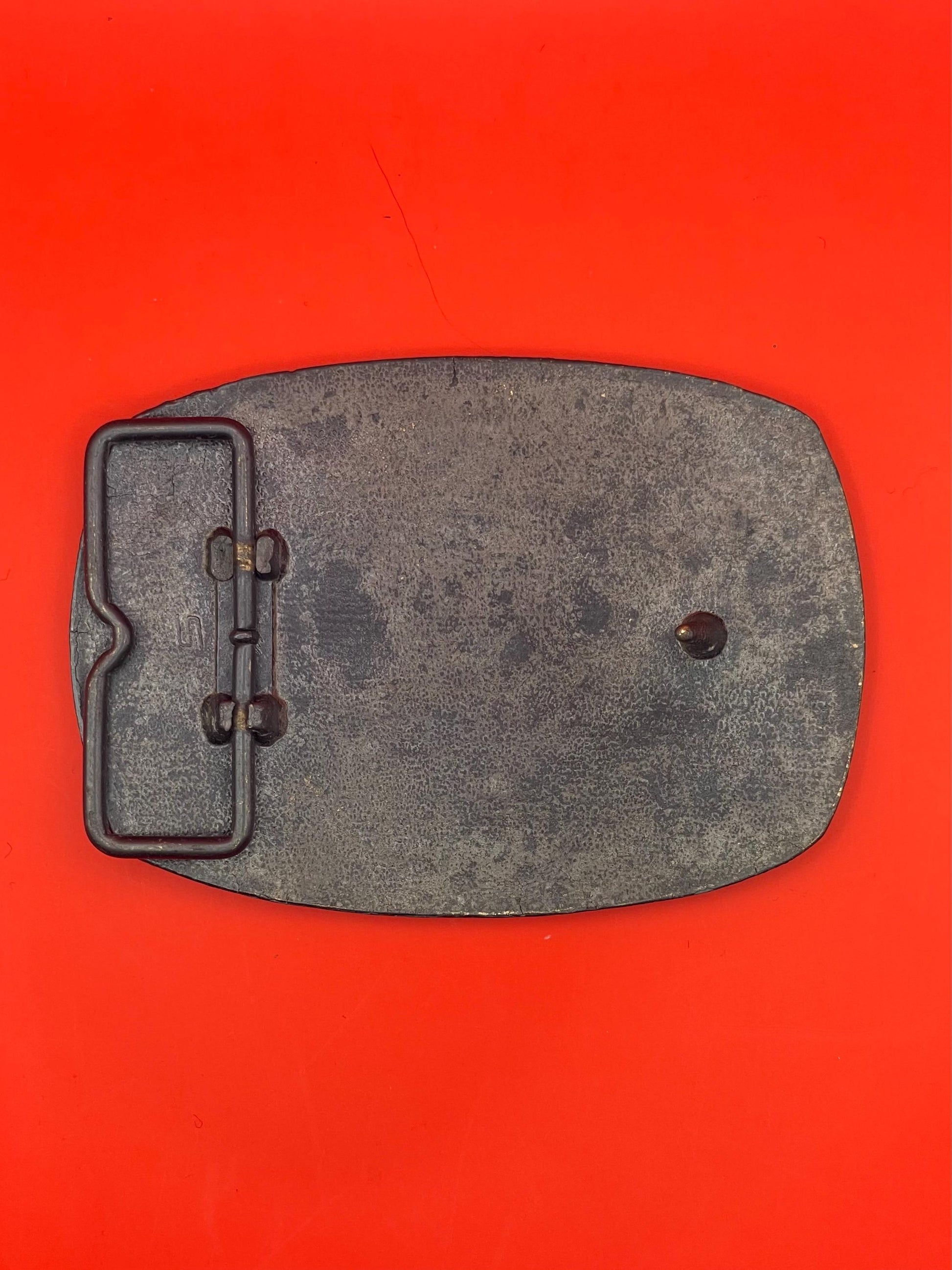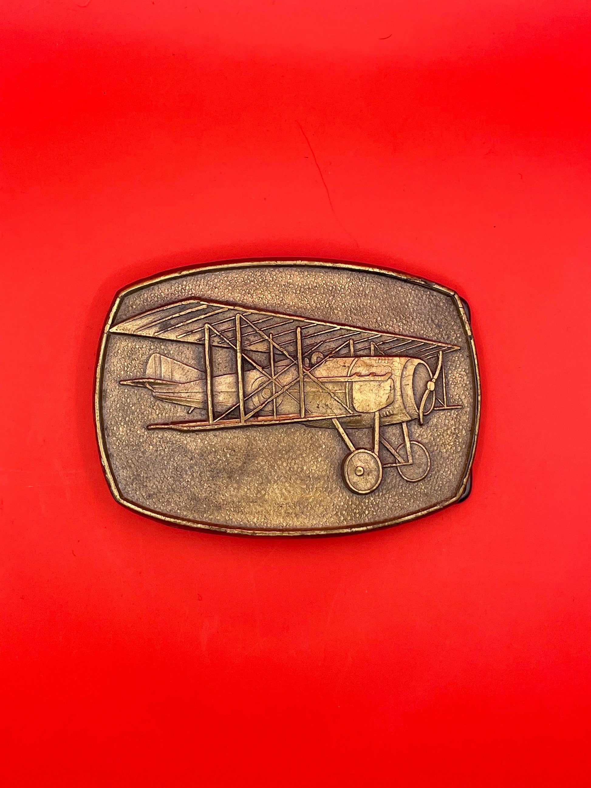 Unique 2.5 x 3.5 inch brass belt buckle featuring a detailed raised design of an early biplane. A great gift for aviation enthusiasts or collectors of vintage accessories.