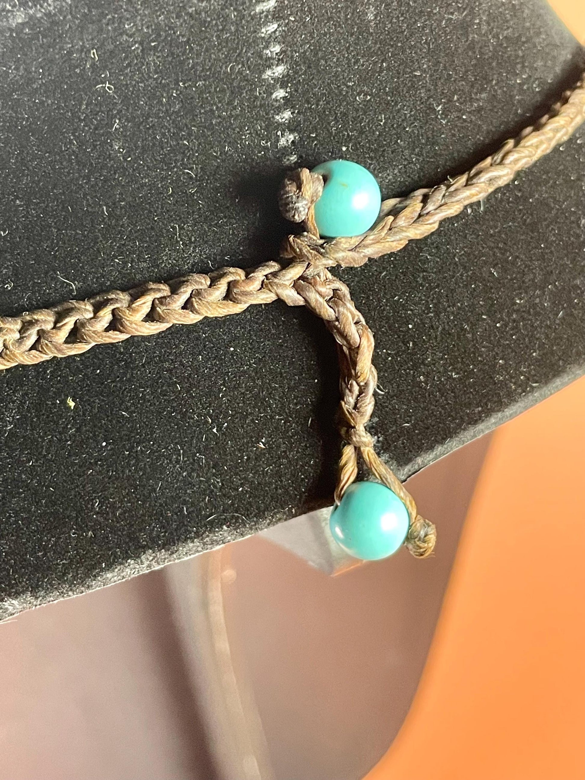 This unique handcrafted necklace features a crocheted base and chain with added stone and bead design in a bold turquoise blue.