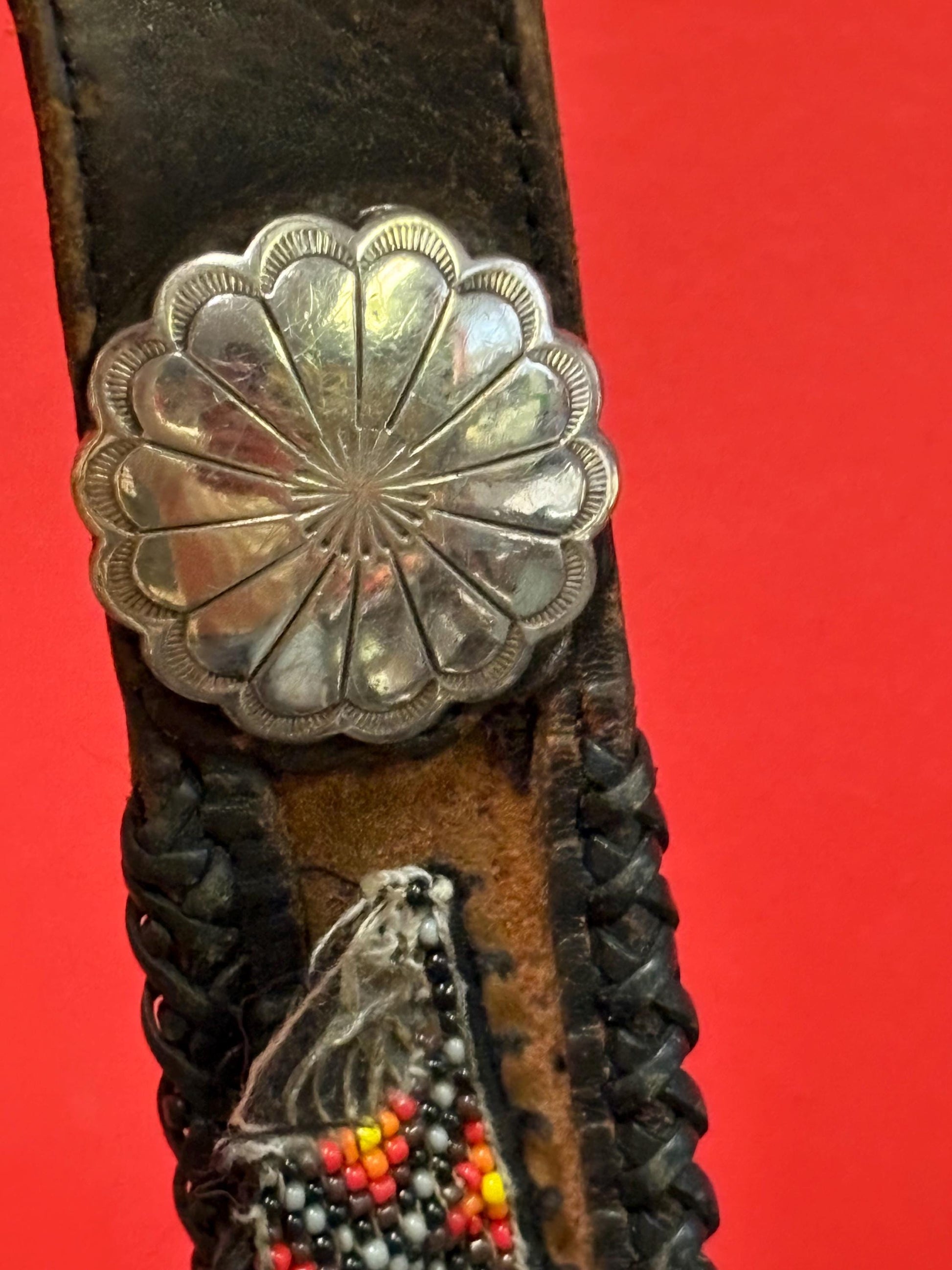 Wonderful 1980s heavy brass Eagle belt buckle with 40 inch leather and beaded indigenous belt belt as is wow